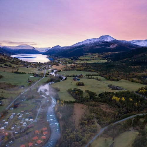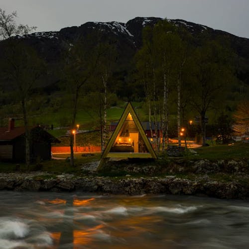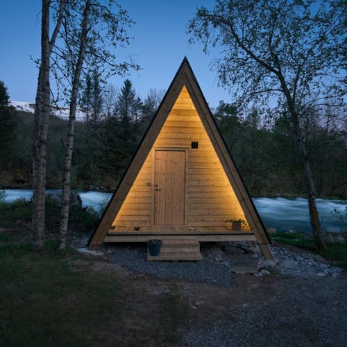 Jolstraholmen é um espaço particular de hospedagem que conta com local para camping além de cabanas construídas para locação, entre elas a River Suite - a cabana em triângulo de frente para uma correnteza com uma paisagem de tirar o fôlego.