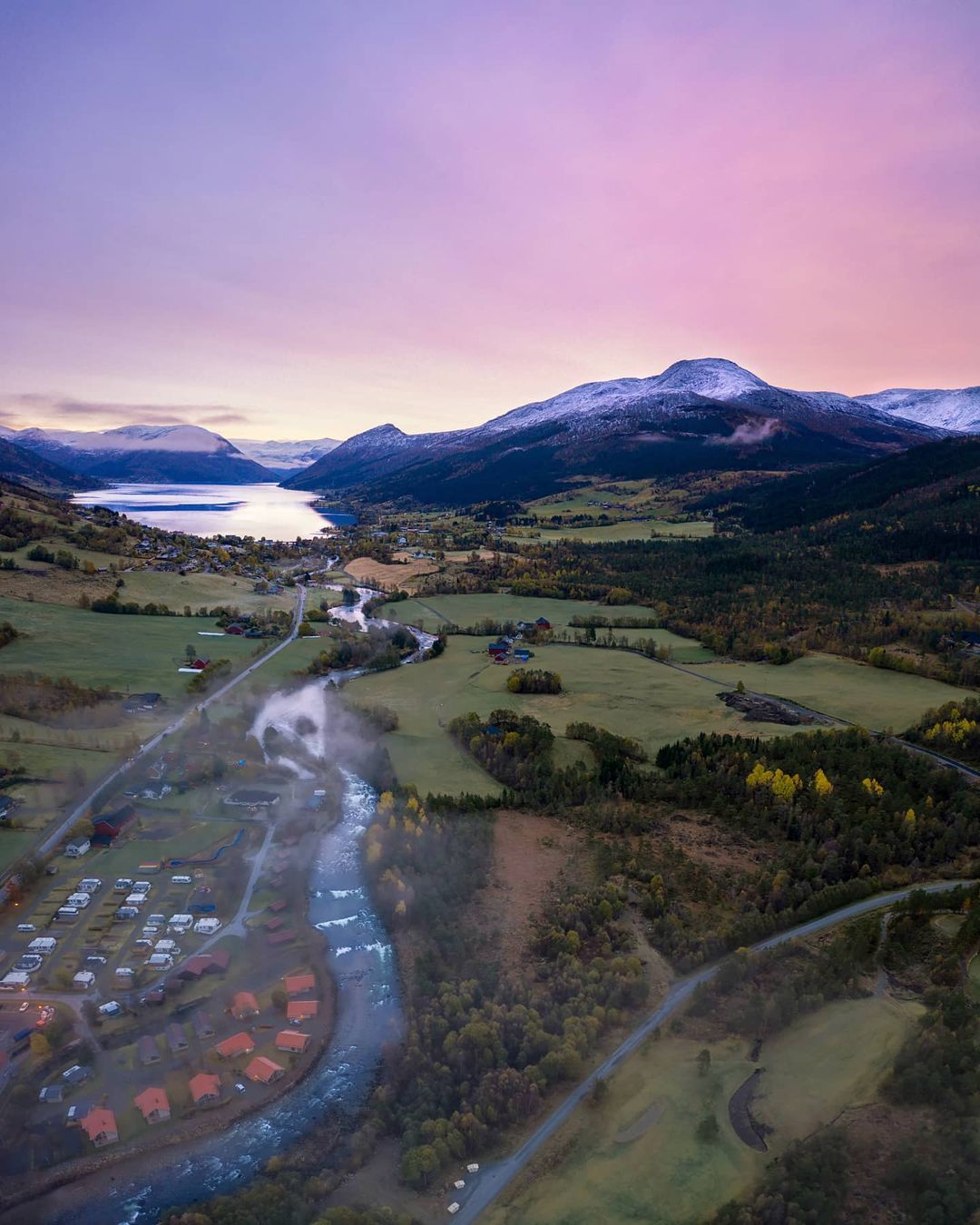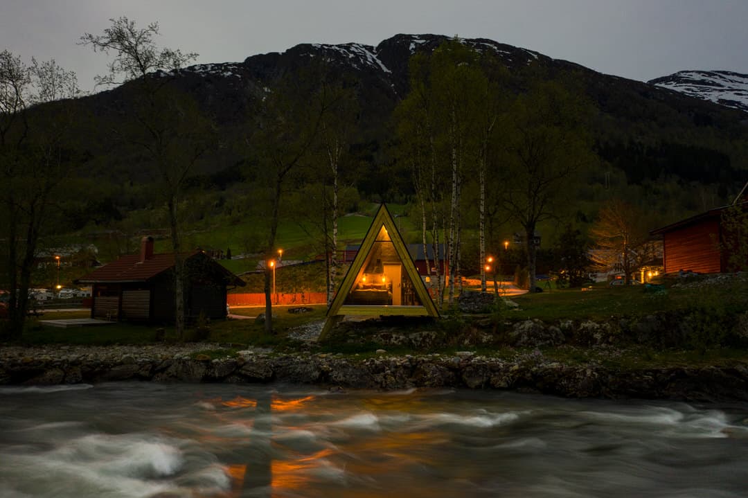Jolstraholmen é um espaço particular de hospedagem que conta com local para camping além de cabanas construídas para locação, entre elas a River Suite - a cabana em triângulo de frente para uma correnteza com uma paisagem de tirar o fôlego.