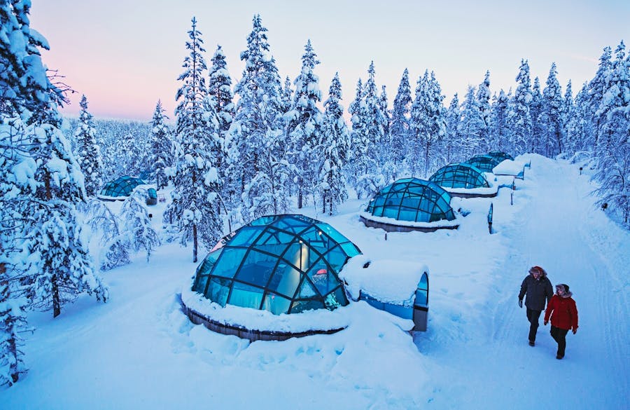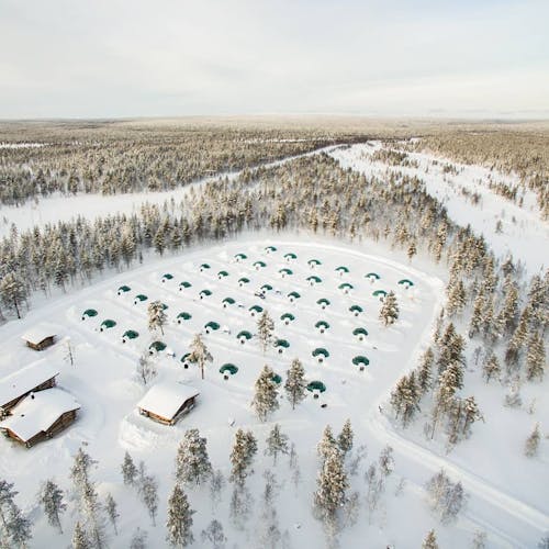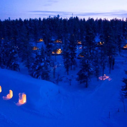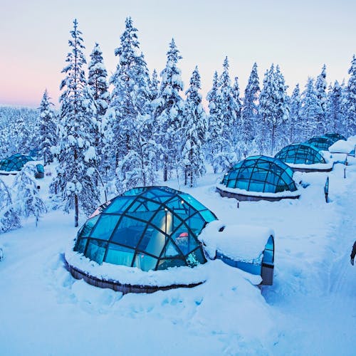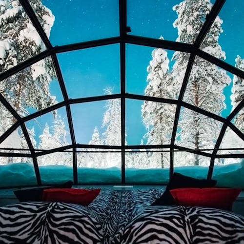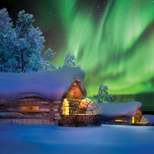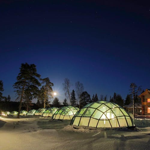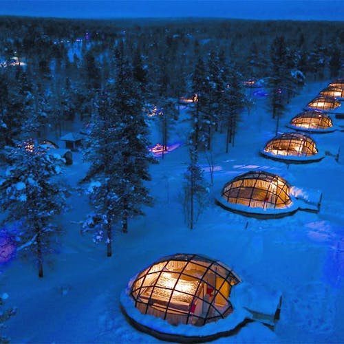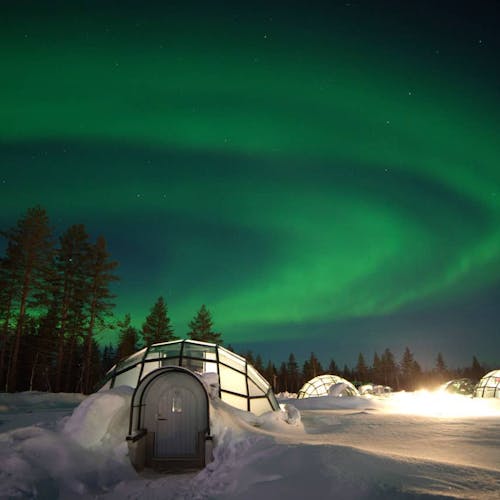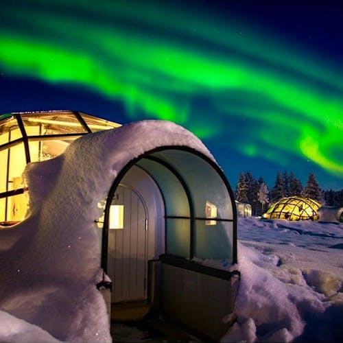 Neste ambiente de natureza selvagem ainda é possível ter a experiência maravilhosa de observar a aurora boreal sem precisar sair de dentro da cabana, apreciando esse espetáculo deitado na sua cama. Além disso, dormir sob o céu cintilando será outra vivência mágica junto da pintura branca da neve. As opções de iglu funcionam tanto para casais quanto para pequenos grupos, são equipados com banheiro mas sauna e chuveiro são em um edifício separado. A reserva funciona durante toda a temporada da aurora, começando por volta de 20 de agosto indo até final de abril.