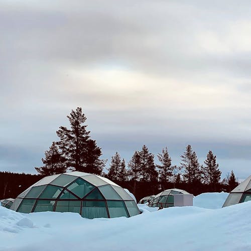 Iglu de vidro imerso na neve: experiência de hospedagem remota sob a aurora boreal