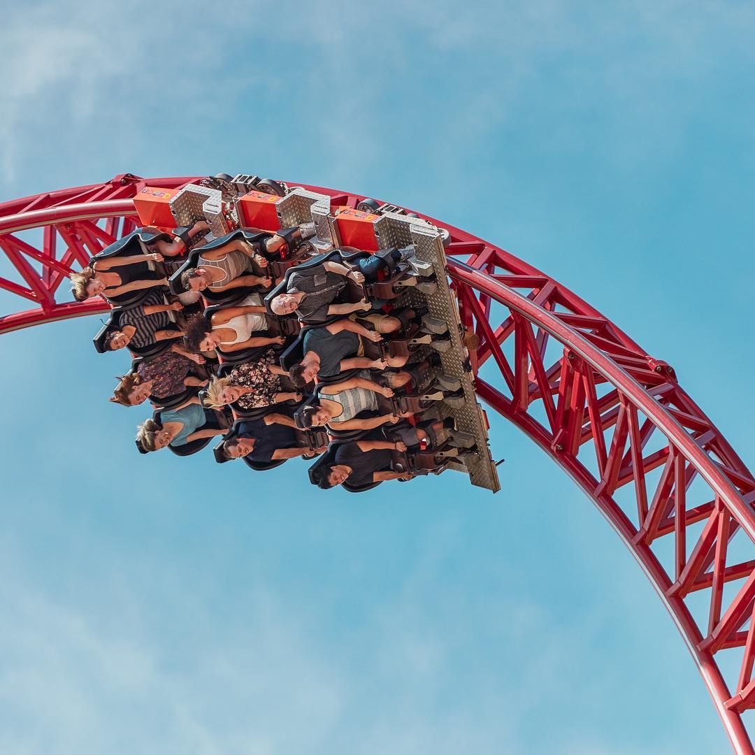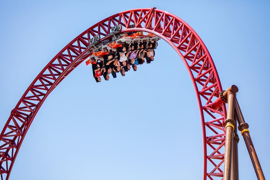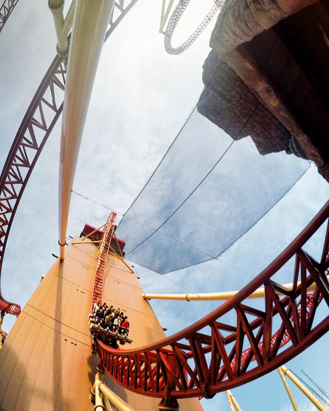 Além da inclinação e da descida de tirar o fôlego, a montanha-russa ainda tem um circuito invertido de quase 43 metros de altura que deixa os corajosos de cabeça pra baixo, além de fazer curvas sinuosas por um cenário aquático. A velocidade chega a até 113 km/h, ao longo de 834 metros através de três inversões‼️