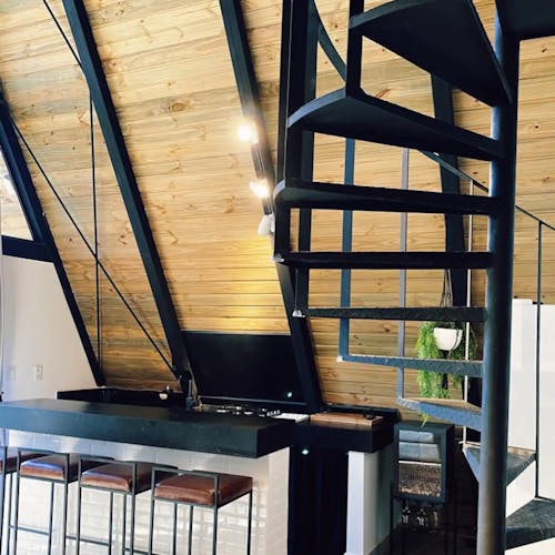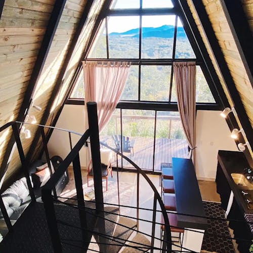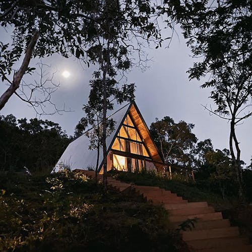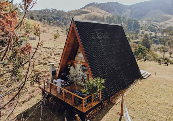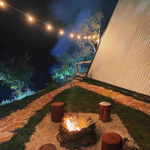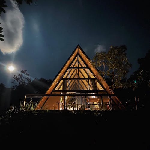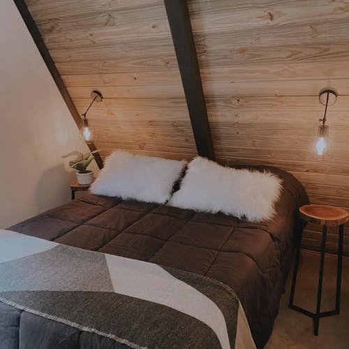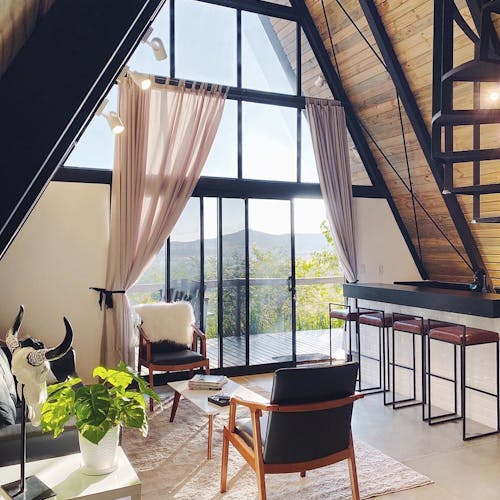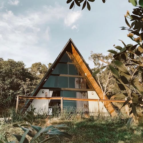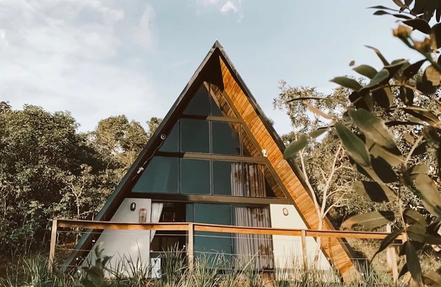 Encontramos mais uma no estilo A-Frame (se você ainda não viu as outras hospedagens, confira nossa sessão Cabanas), dessa vez chegamos em Goiás, localizada no Sítio Pucón, próximo à cachoeiras e natureza.