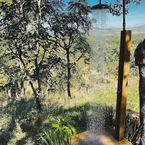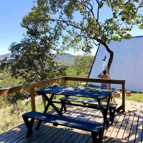 A cabana hospeda duas pessoas e tem trilhas e fogueira pra curtir! Na área externa, além da fogueira tem uma mesa para refeições junto da natureza e um chuveiro para banho ao ar livre!