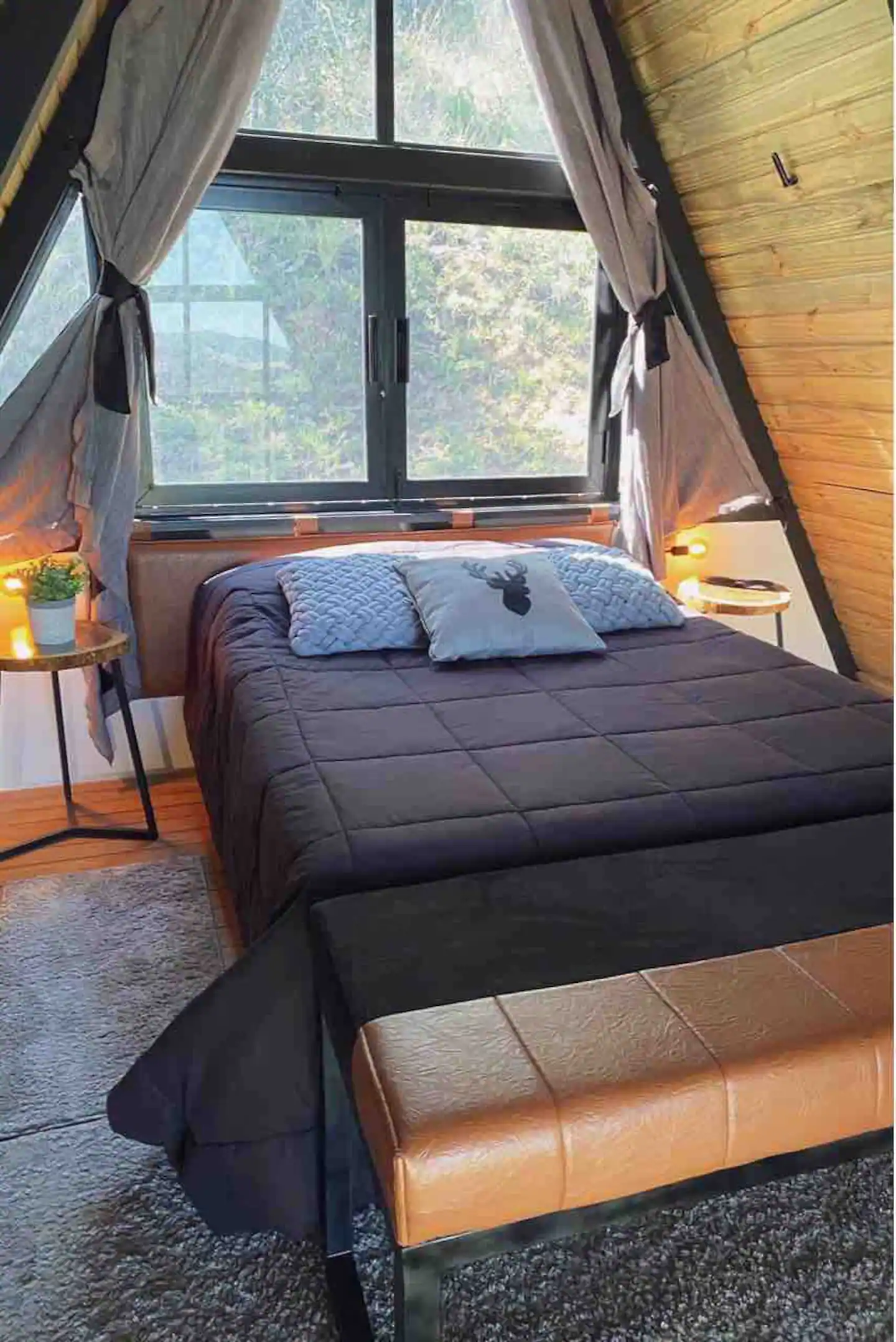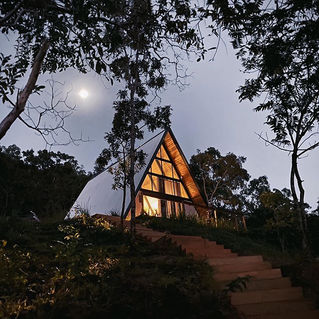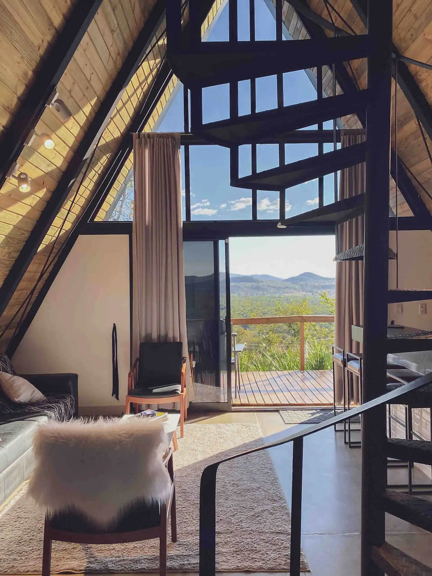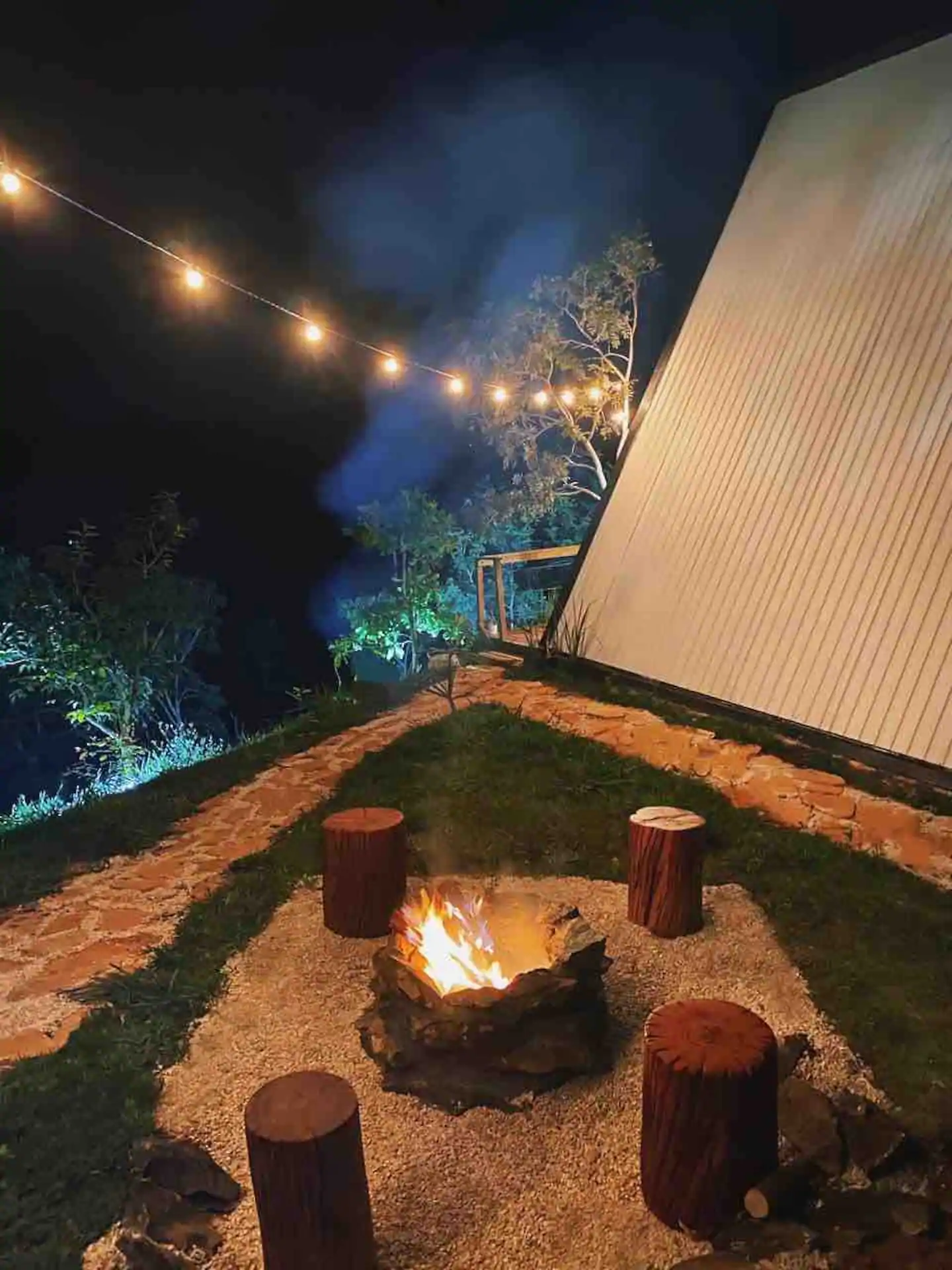 Encontramos mais uma no estilo A-Frame (se você ainda não viu as outras hospedagens, confira nossa sessão Cabanas), dessa vez chegamos em Goiás, localizada no Sítio Pucón, próximo à cachoeiras e natureza.