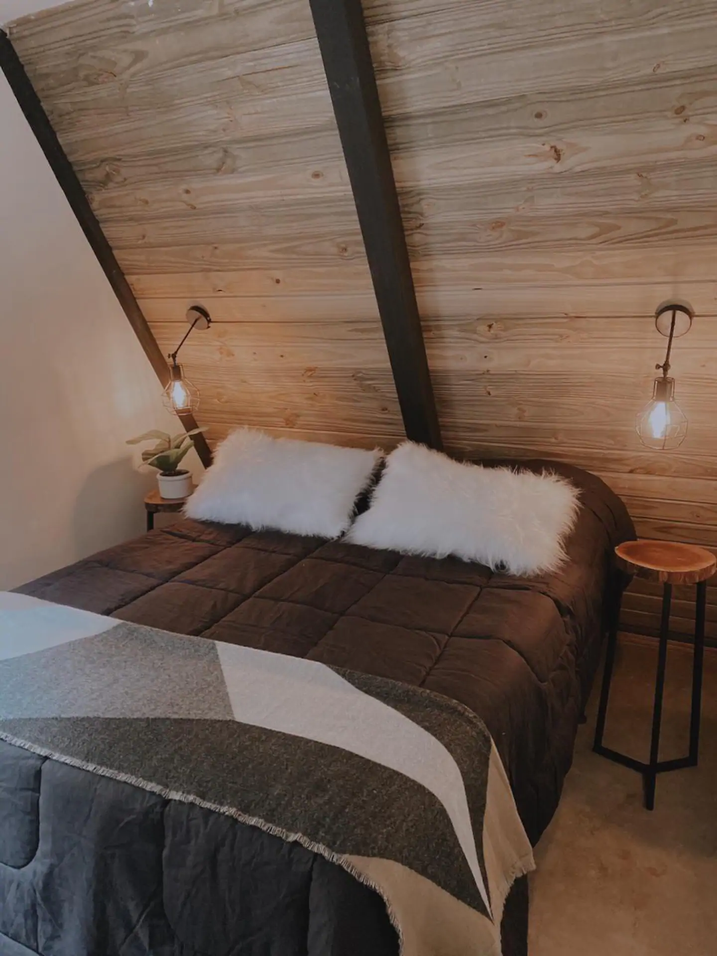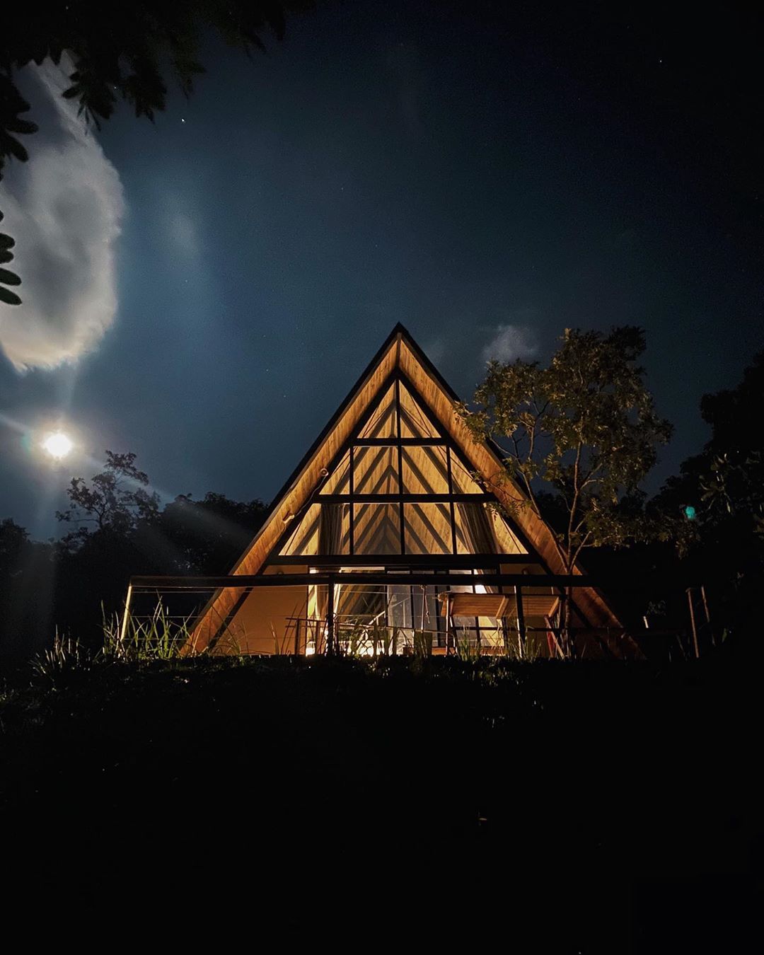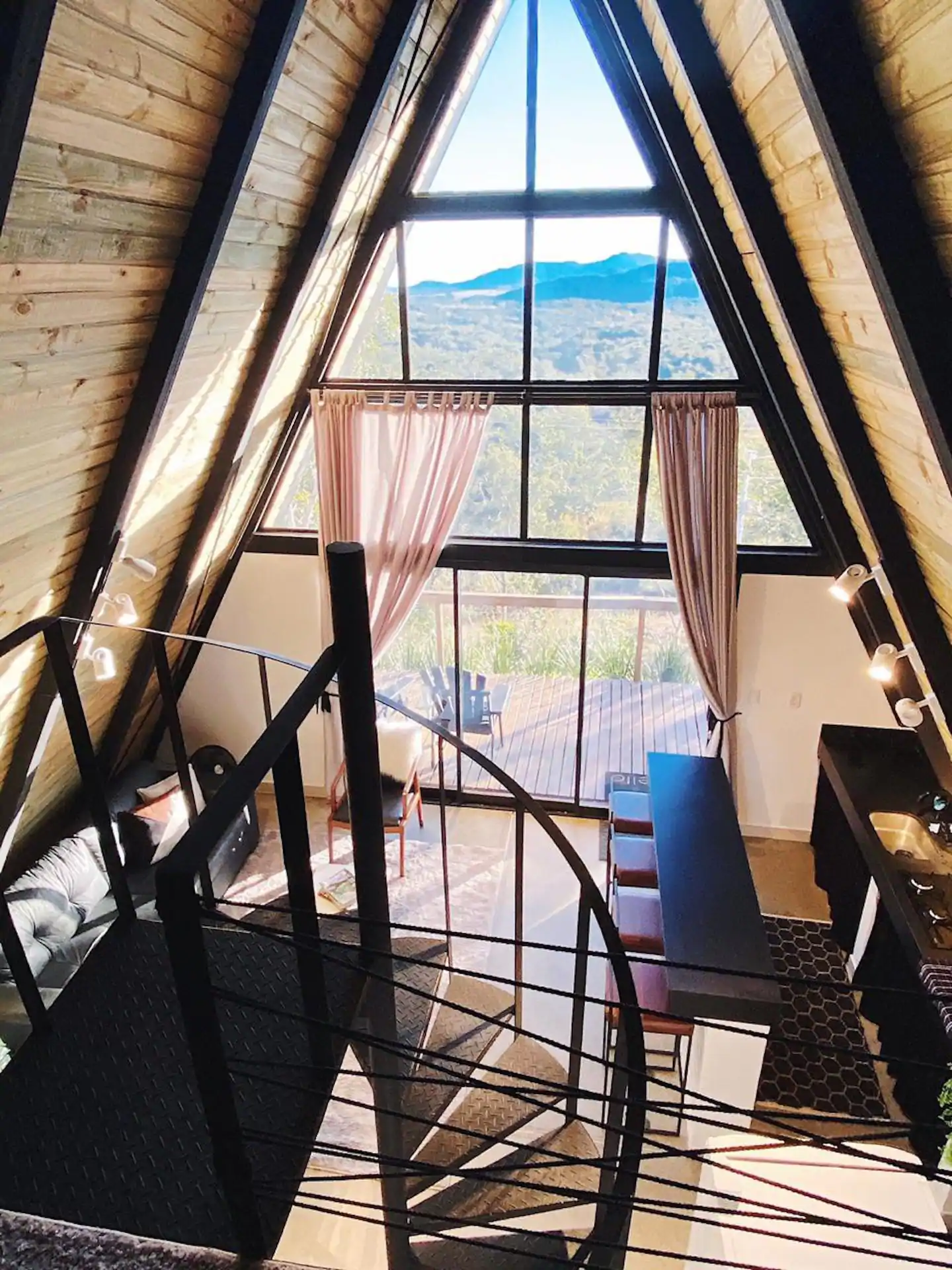 Encontramos mais uma no estilo A-Frame (se você ainda não viu as outras hospedagens, confira nossa sessão Cabanas), dessa vez chegamos em Goiás, localizada no Sítio Pucón, próximo à cachoeiras e natureza.
