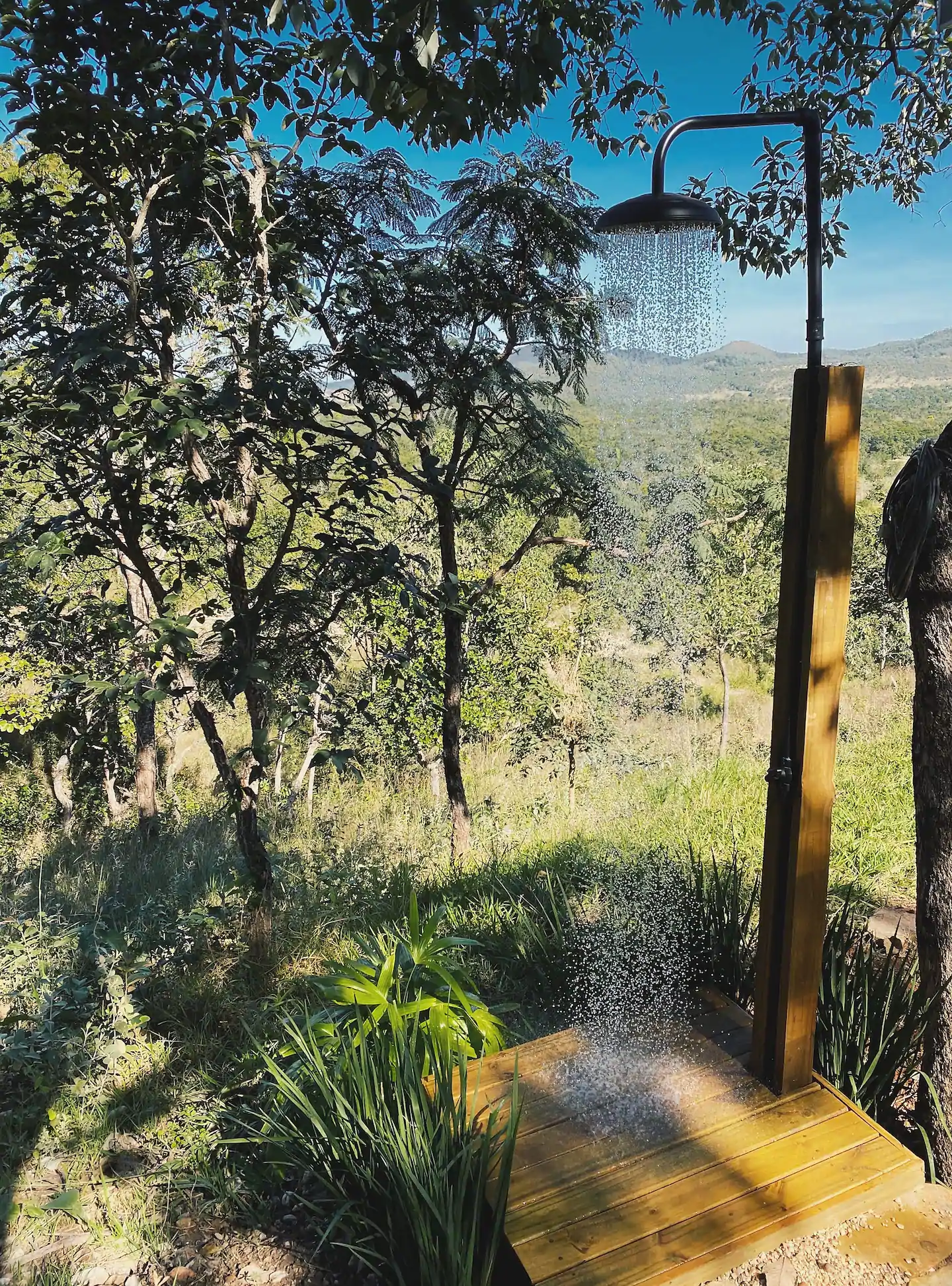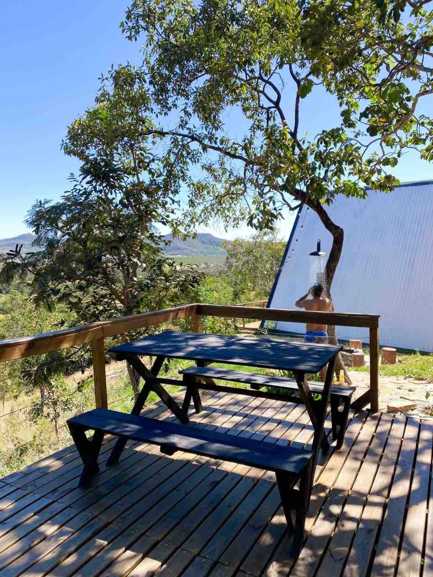 A cabana hospeda duas pessoas e tem trilhas e fogueira pra curtir! Na área externa, além da fogueira tem uma mesa para refeições junto da natureza e um chuveiro para banho ao ar livre!