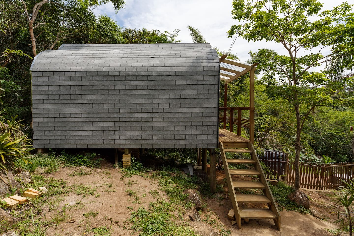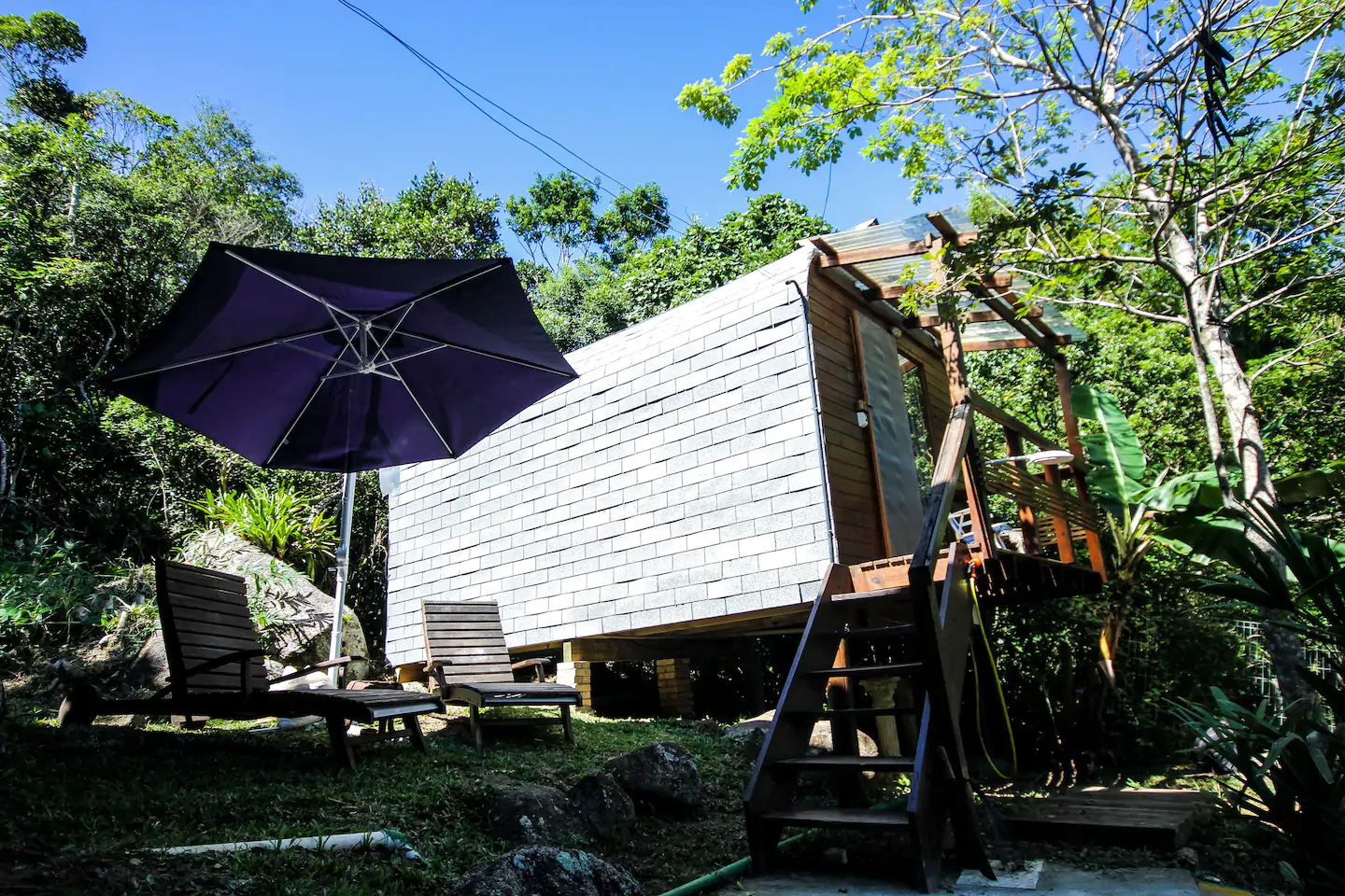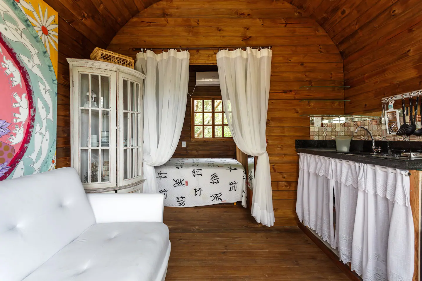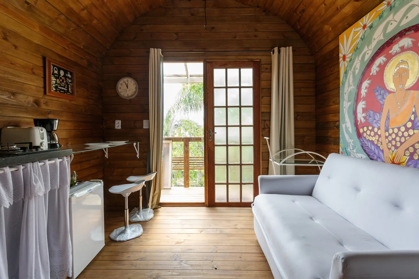 Essa de madeira encontramos em um morro em Florianópolis, pra quem curte uma aventura diferente. As Microcasas como são chamadas por aqui, tem uma dimensão de 8 a 40 metros quadrados e isso somado ao estilo cool e tudo equipado com apenas o essencial, é o que as torna especiais. Aqui são no total 18 metros quadrados, sendo 3 de largura e 6 de comprimento - hospeda no máximo 2 pessoas.