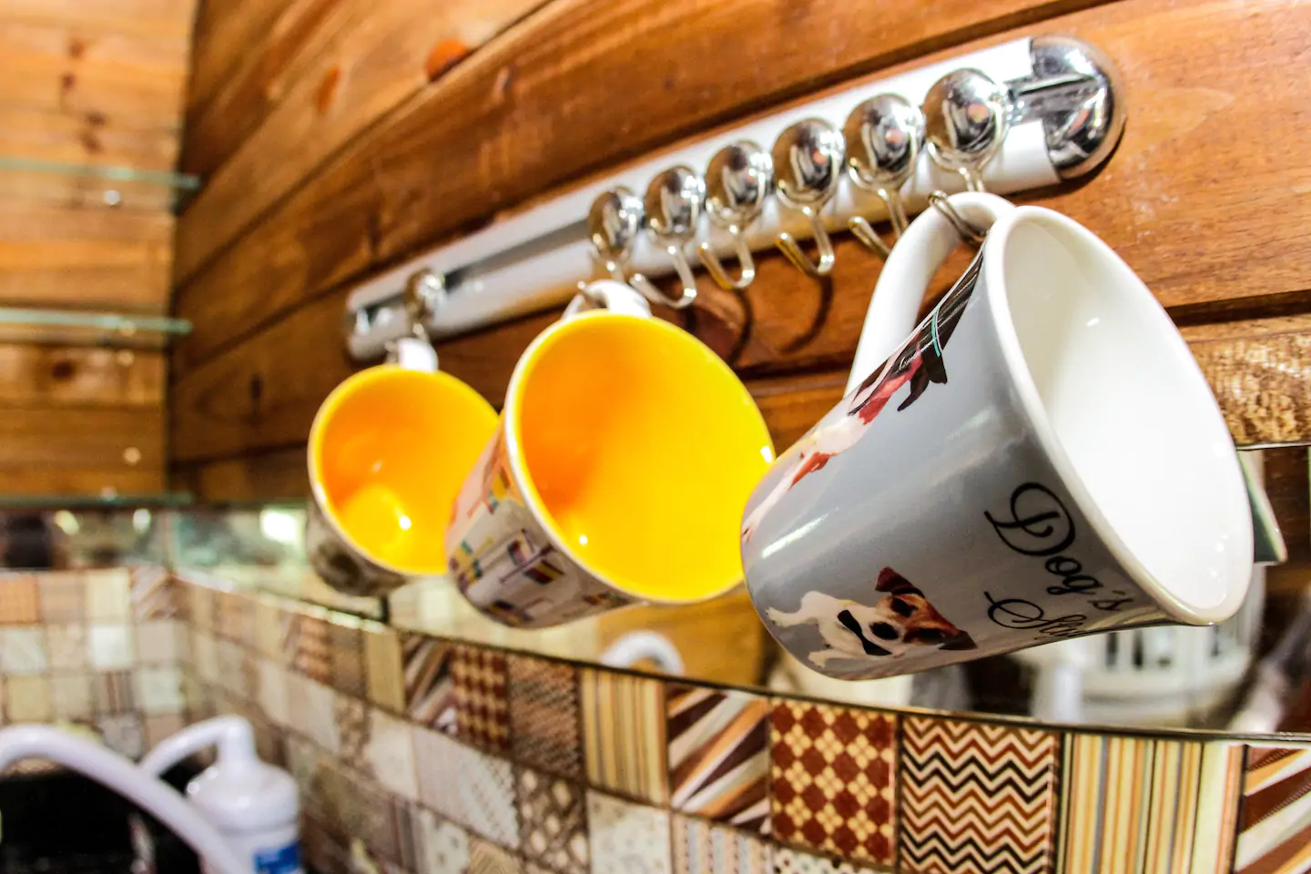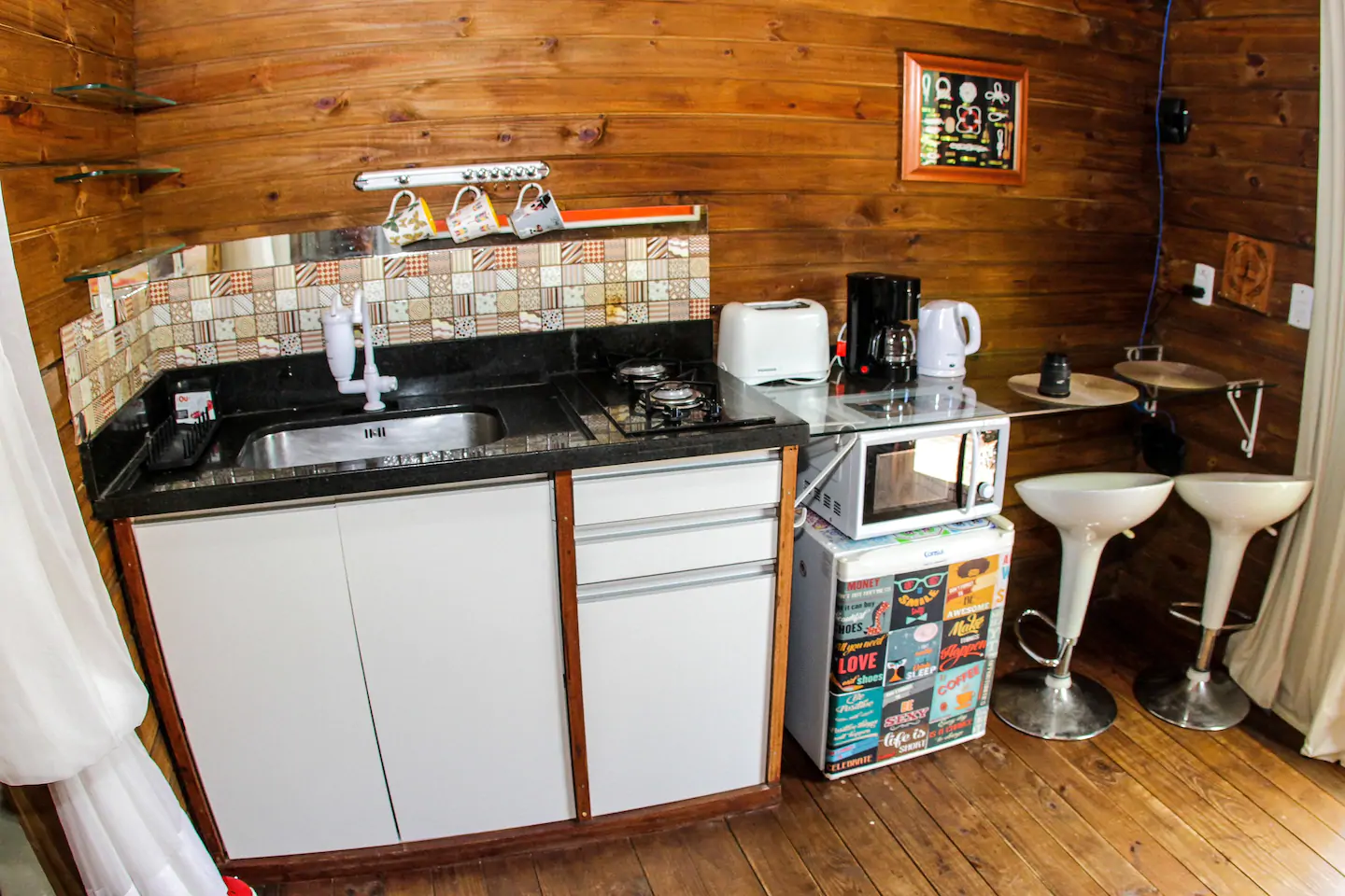 A casa compartilha jardim com outra casa principal do local, porém o espaço interno da Tiny é todo de quem aluga, sem intervenções.