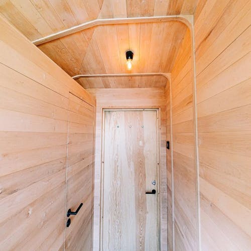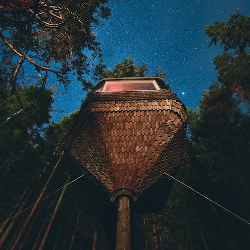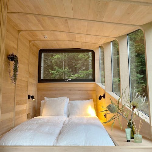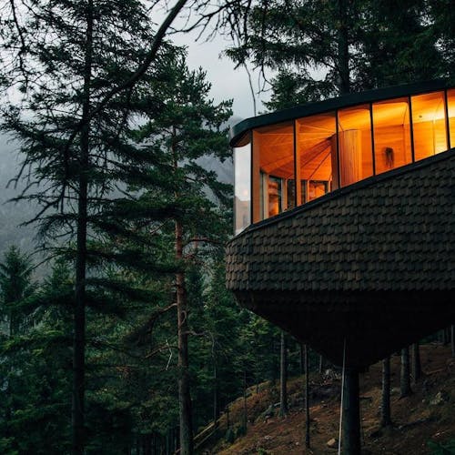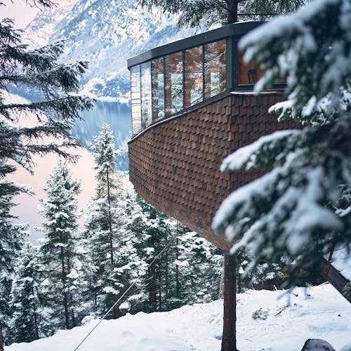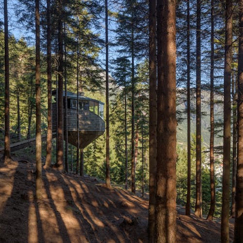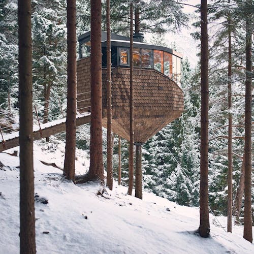 Cada casa fica a 10 metros de altura em altos pinheiros, com estrutura forte e texturas que deixam qualquer arquiteto de boca aberta. O interior é composto de madeira refinada e toda a casa é cercada de grandes janelas de vidro, o que transforma a experiência em algo espetacular já que as cabanas tem uma vista incrível para o belíssimo lago e para os bosques ao entorno.