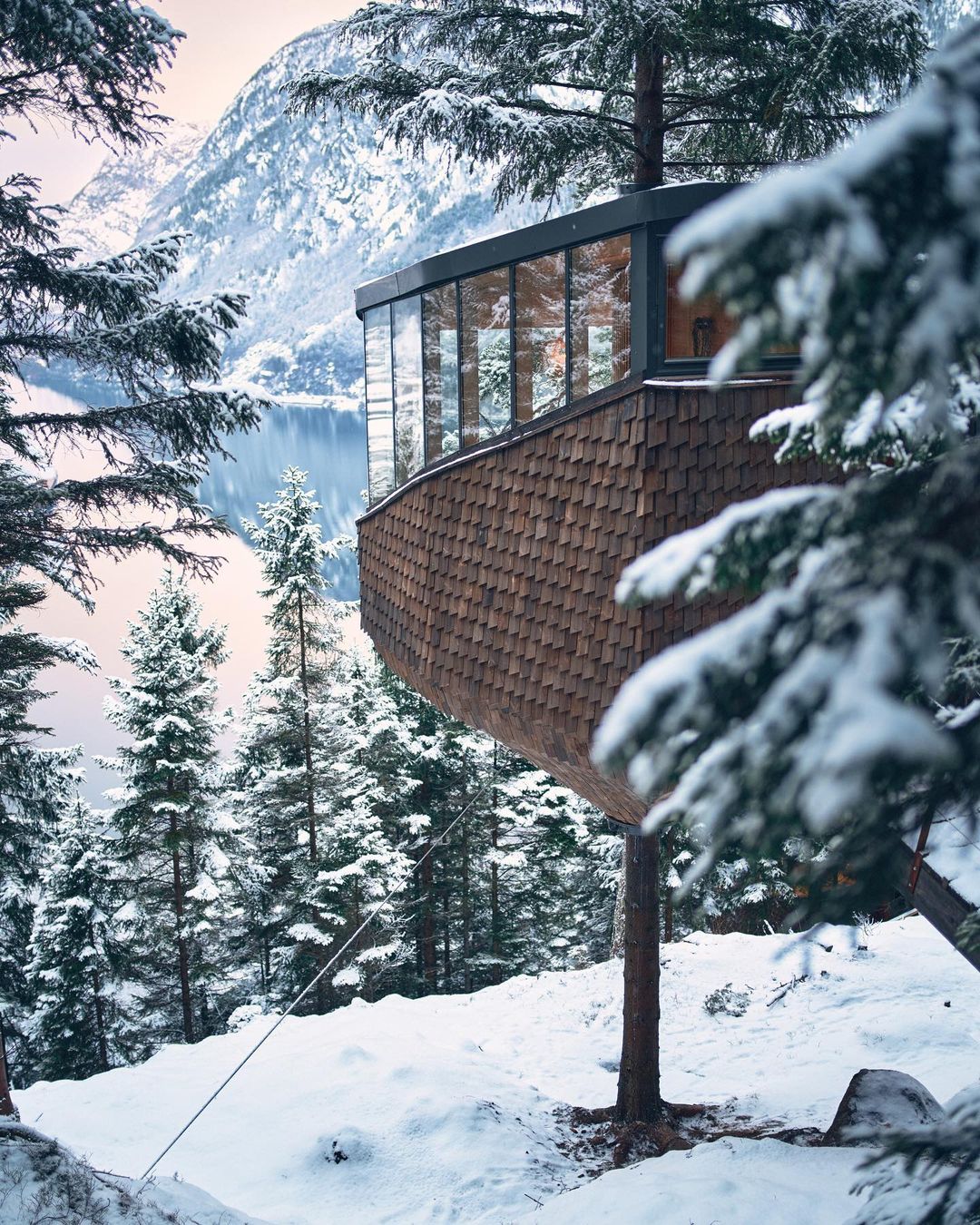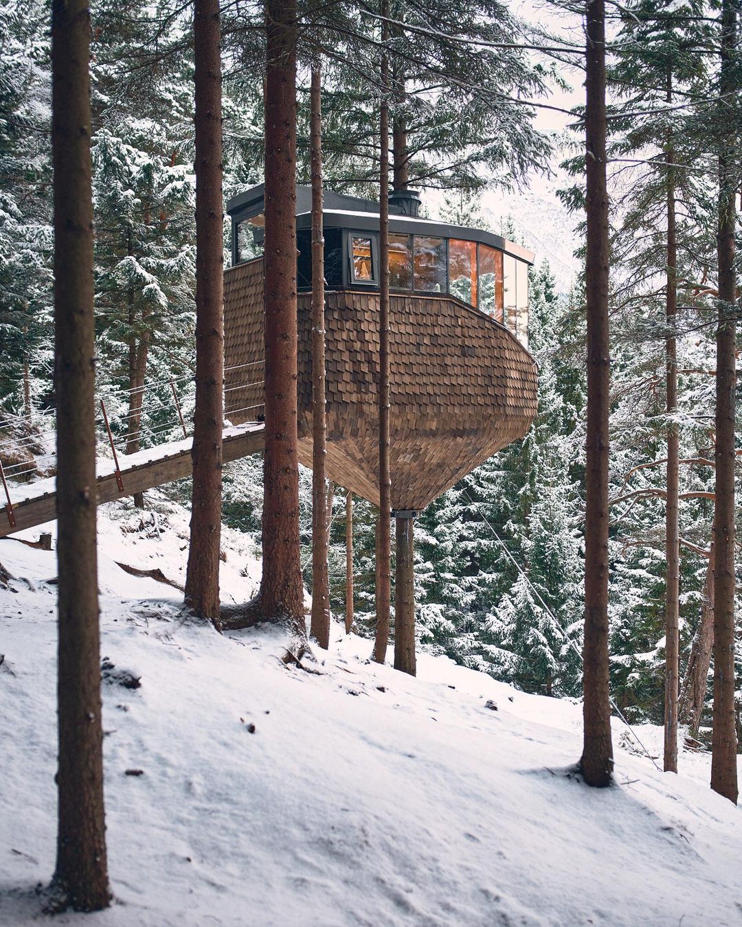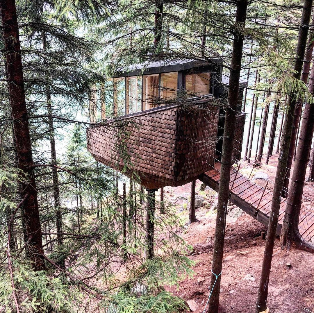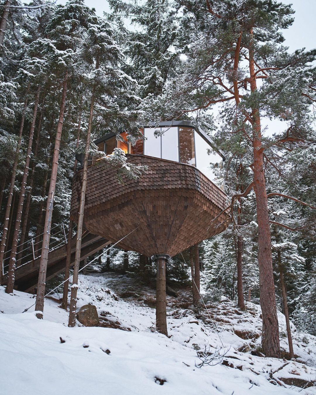 Cada casa fica a 10 metros de altura em altos pinheiros, com estrutura forte e texturas que deixam qualquer arquiteto de boca aberta. O interior é composto de madeira refinada e toda a casa é cercada de grandes janelas de vidro, o que transforma a experiência em algo espetacular já que as cabanas tem uma vista incrível para o belíssimo lago e para os bosques ao entorno.