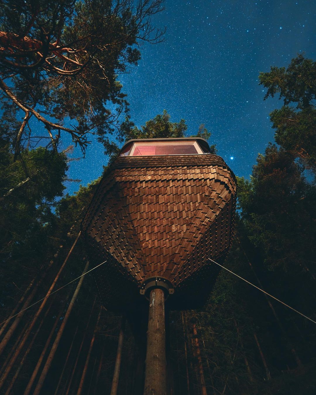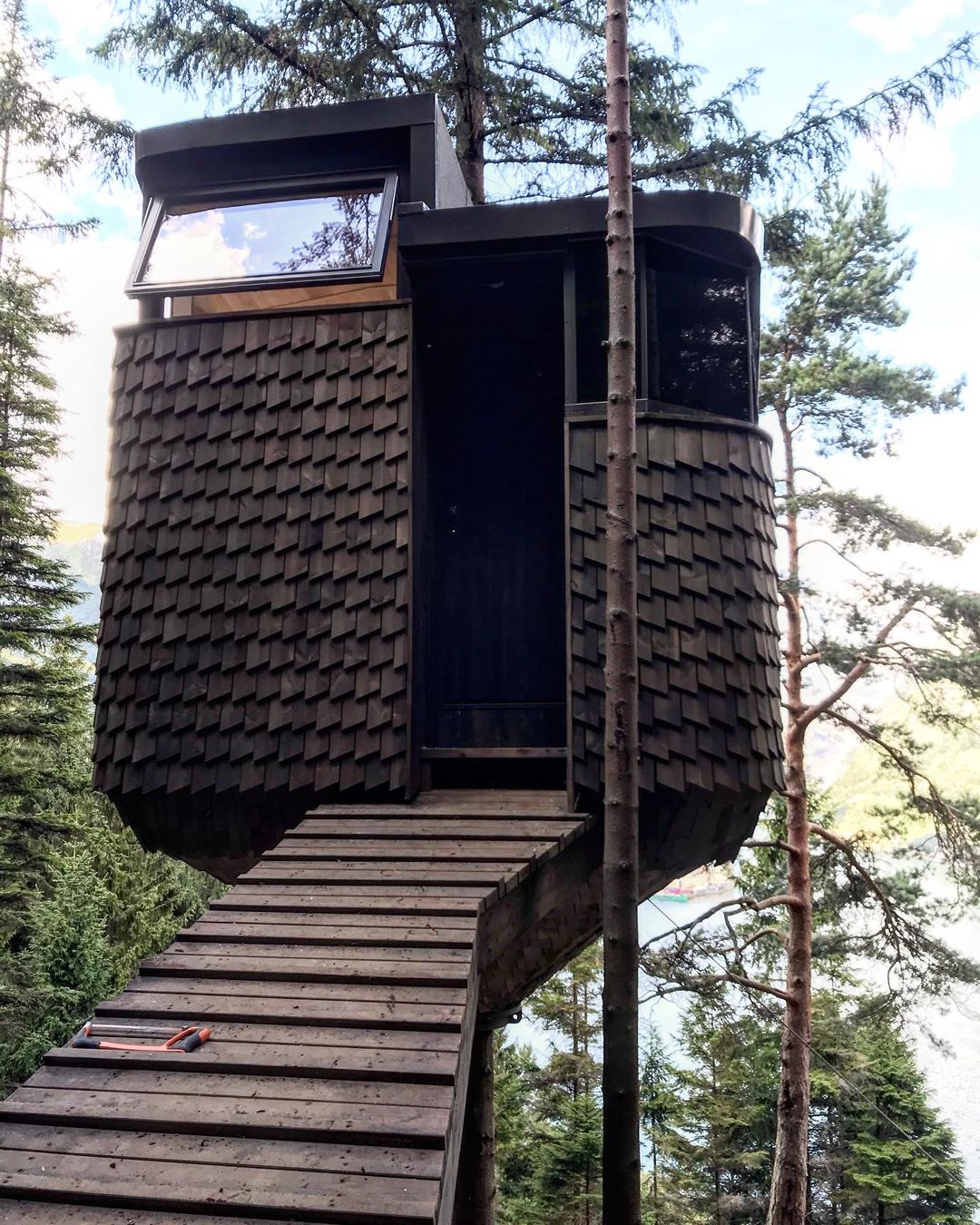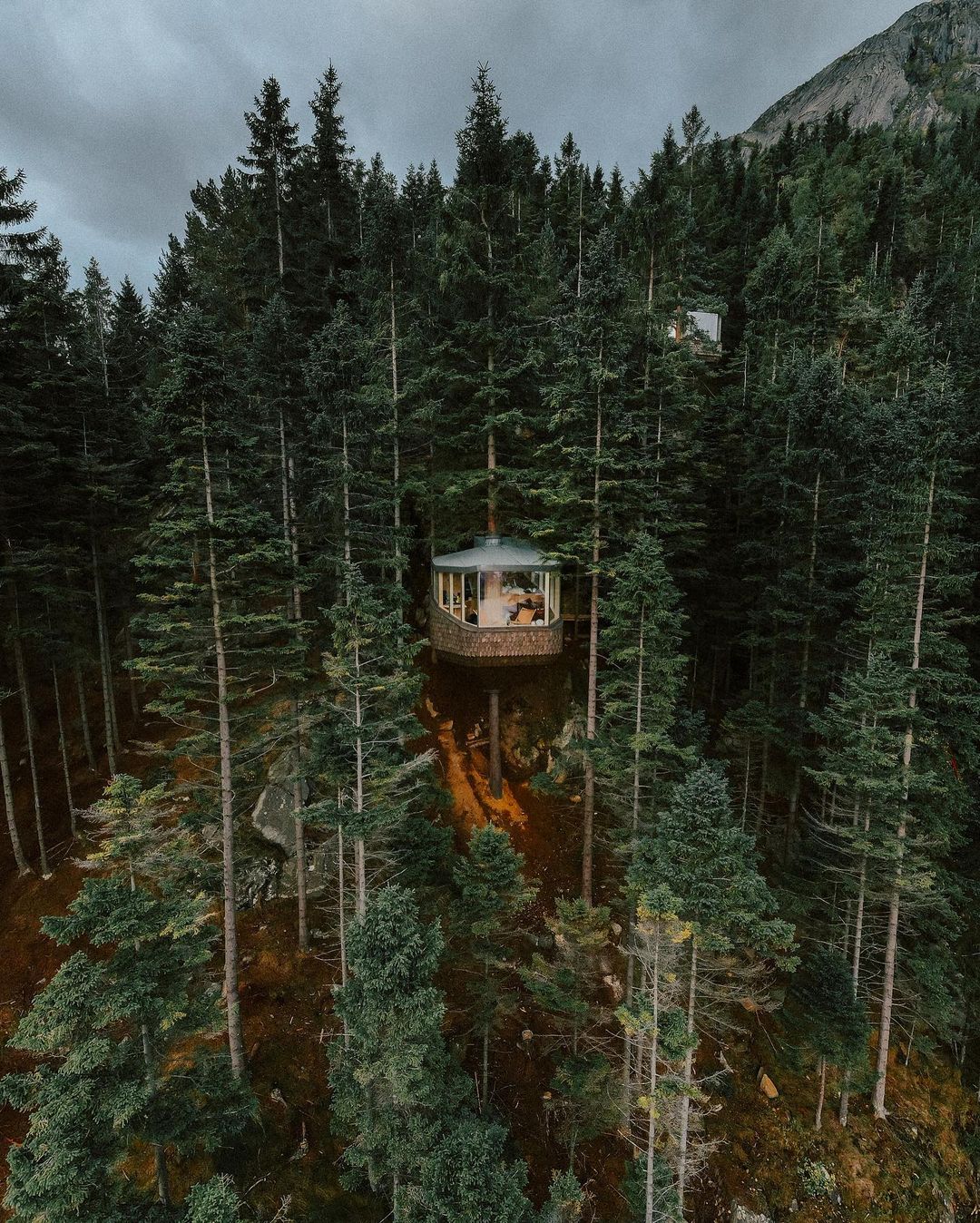 Woodnest, o local que abriga a casa na árvore, foi criado por um casal com uma filha pequena, em uma pequena ilha na Noruega. O pai é eletricista de profissão, e um faz-tudo completo. Ele contribuiu significativamente para a construção do local, desde as escadas, até o interior da cabana e todo trabalho elétrico. Já a mãe é a principal comunicadora com os hóspedes e trabalha no gerenciamento da Woodnest, adora design e cuida para que os detalhes estejam sempre impecáveis, já que essas casas na árvore se tratam de um modelo embora minimalista e pequeno, cheio de conforto e qualidade.