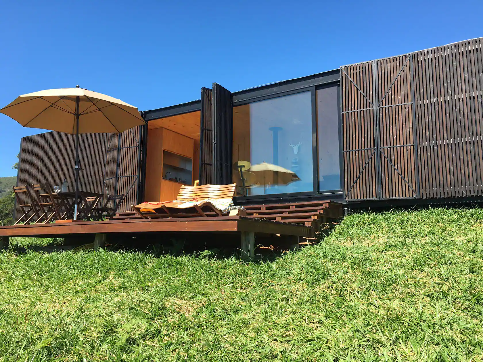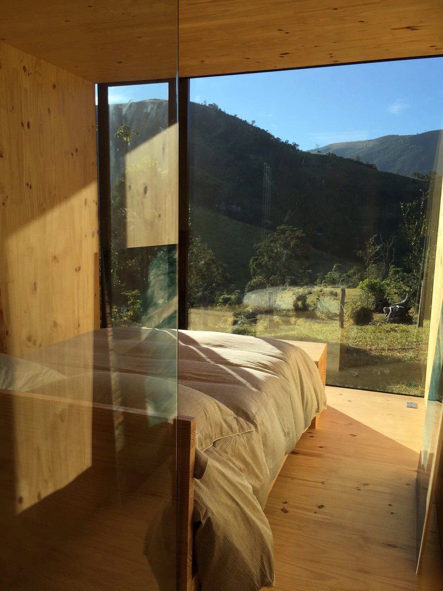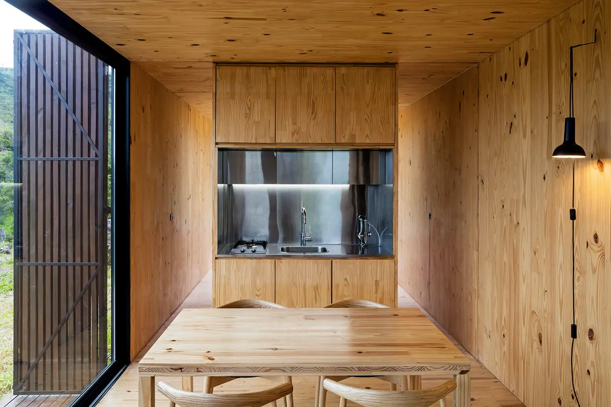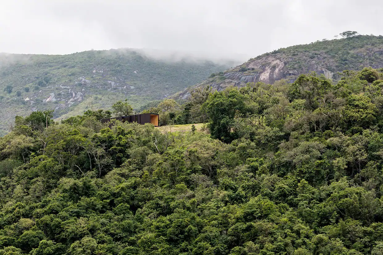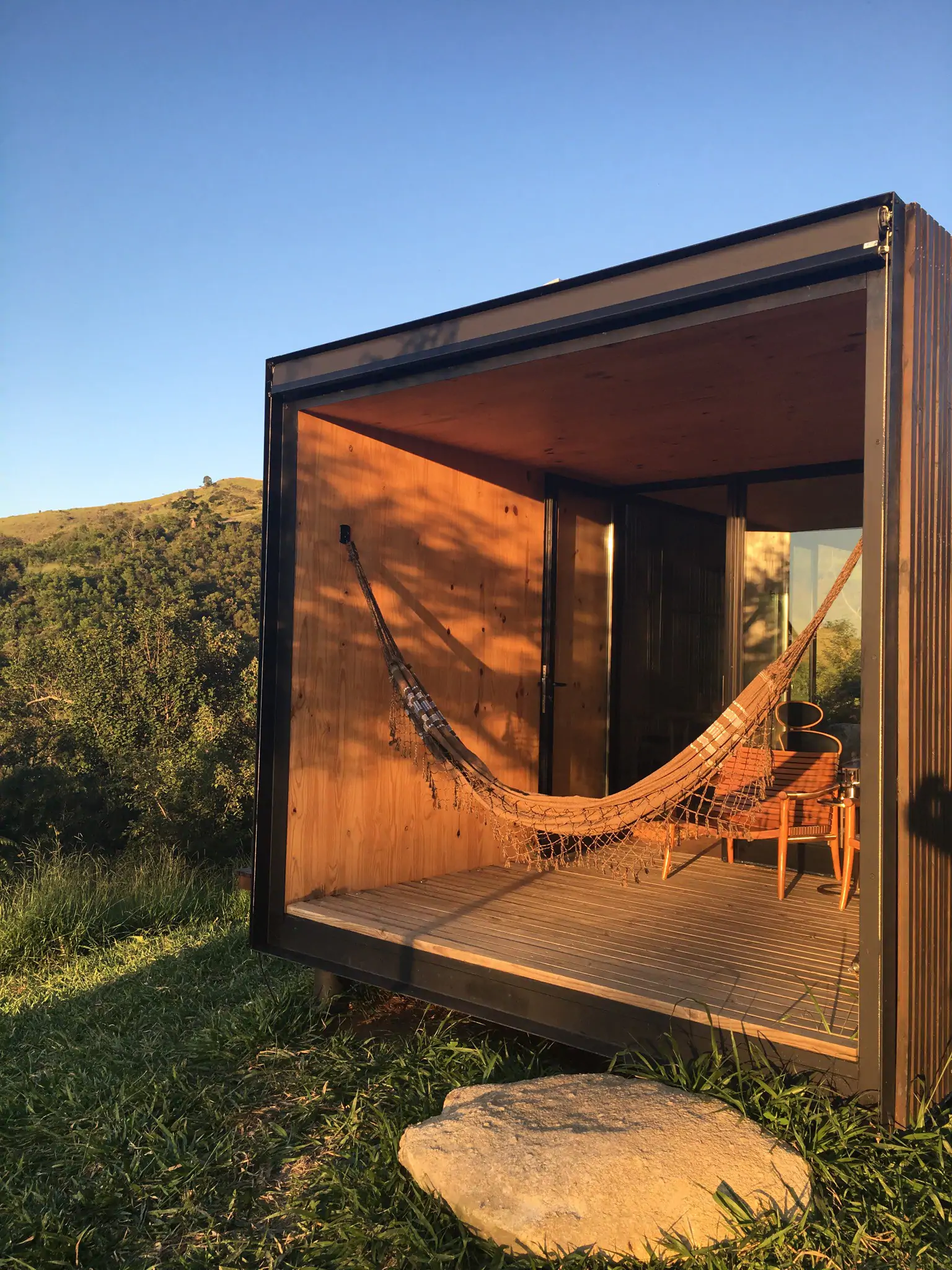 MINIMOD como é chamada essa construção, é um tipo de cabana ecológica. Não tem sinal de telefone, o local é totalmente isolado e remoto. A energia é solar.
