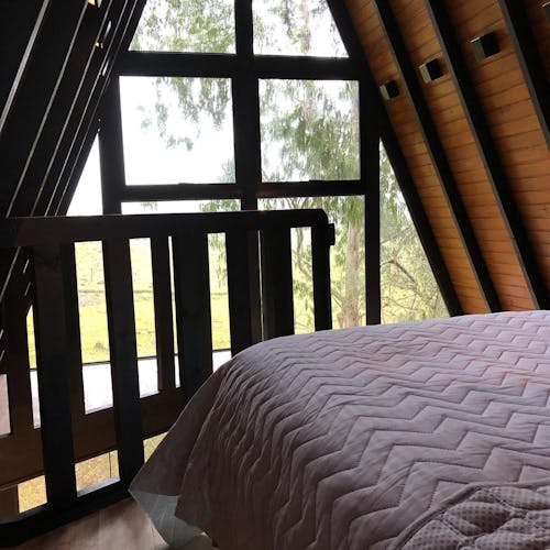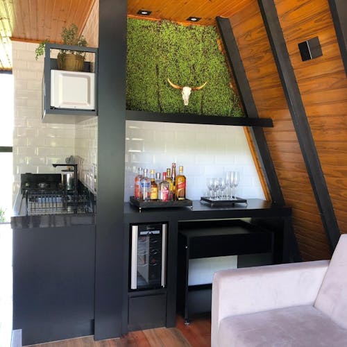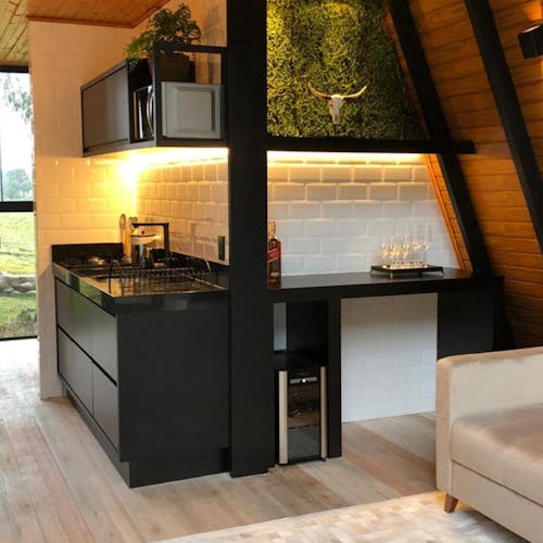 No mezanino fica localizada a cama com vista para o espaço verde do jardim. Na cozinha equipada, tudo que é necessário para fazer as próprias refeições no local. Na sala pra completar o aconchego de passar esse tempo na Serra, uma lareira, tv e frigobar compõe o ambiente.
