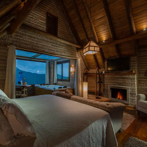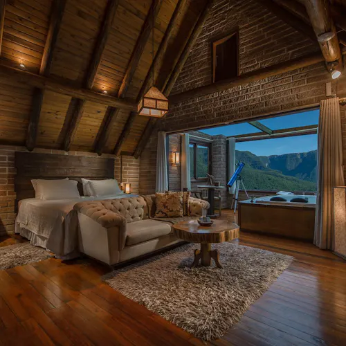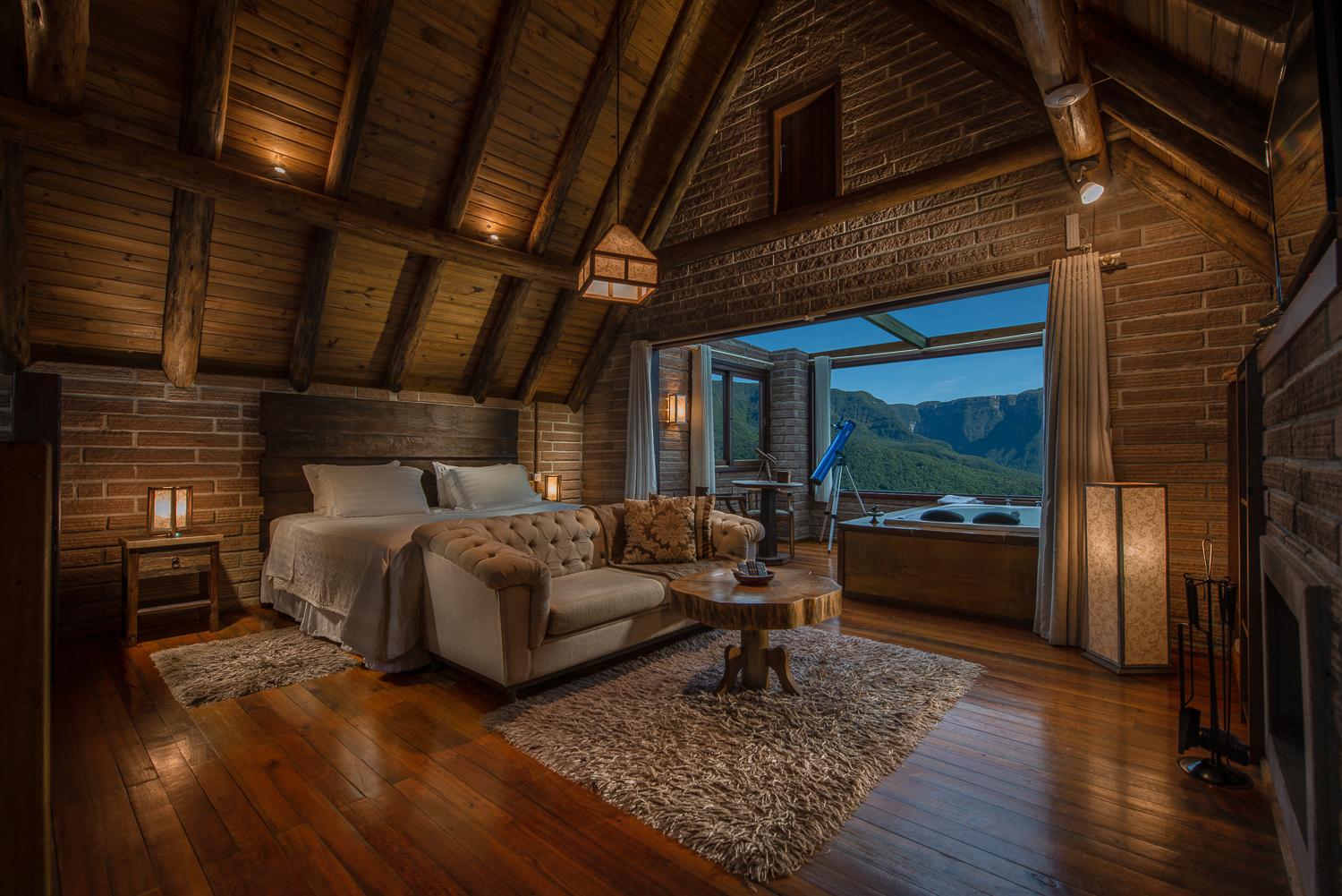 Um chalé de decoração sofisticada e ao mesmo tempo rústica, parcialmente aberto para apreciar as estrelas e os canyons dos parques nacionais que ficam logo à frente, ambos se completam com as experiências oferecidas pelo local.