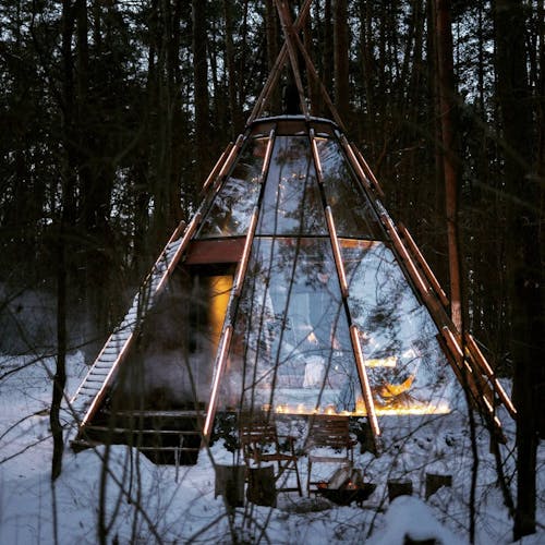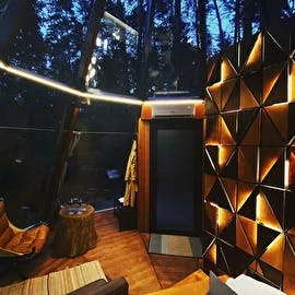 Com paredes de vidro temperado, o quarto cria a sensação de estar completamente escondida na floresta de pinheiros centenários. Adormecer sob as estrelas e acordar com os primeiros raios de sol, ouvir apenas o silêncio e vento sem acordar e ir correndo para lugar nenhum - esta é a ideia principal da NeoTipi, a cabana estilo teepee com vistas deslumbrantes em qualquer época do ano!