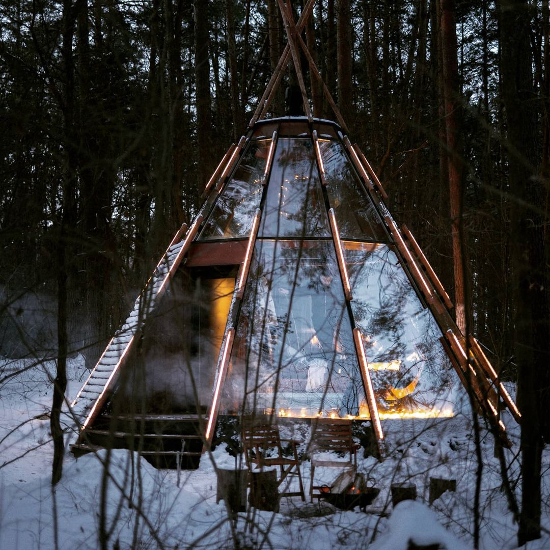 Com paredes de vidro temperado, o quarto cria a sensação de estar completamente escondida na floresta de pinheiros centenários. Adormecer sob as estrelas e acordar com os primeiros raios de sol, ouvir apenas o silêncio e vento sem acordar e ir correndo para lugar nenhum - esta é a ideia principal da NeoTipi, a cabana estilo teepee com vistas deslumbrantes em qualquer época do ano!