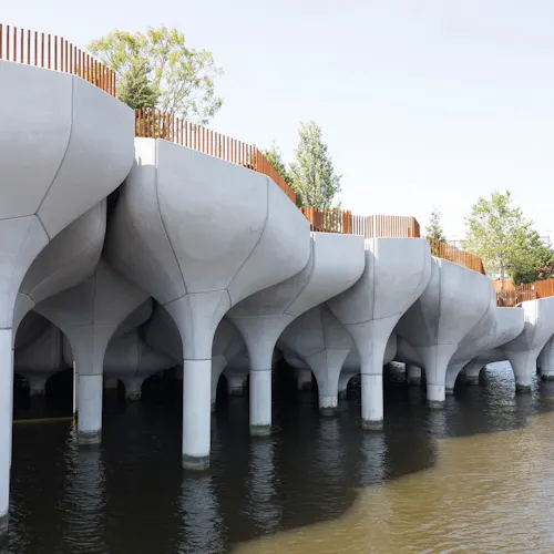 O projeto foi assinado pelo inglês Thomas Heatherwick, o mesmo que desenhou o The Vessel - imensa obra de arte interativa contruída no Hudson Yards, foi apresentando pela primeira vez em 2014 e ficou por anos embargado sob alegações de que a construção prejudicaria a fauna do Rio Hudson. Com o tempo as agências ambientais autorizaram o início das obras.