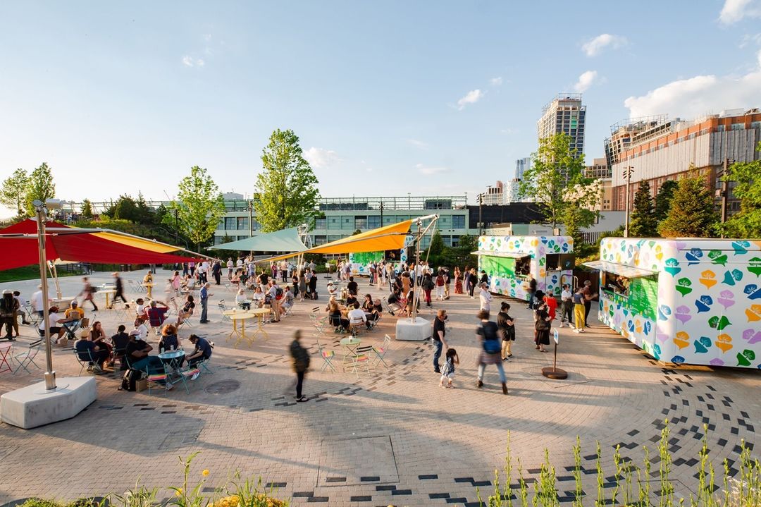 🍟. Opções de confeitarias, cafés e restaurantes irão ofertar mais uma opção de gastronomia e lazer no local, desde o café da manhã até o jantar. As ofertas de comida em Little Island serão fornecidas por fornecedores locais. Entre as opções de bebidas, apresentam as cervejas das melhores cervejarias artesanais das regiões de Nova York e vinhos com raízes locais. Com datas prévias no calendário, performances artísticas com viés sustentável sobre resíduos e alimentação, também serão abordados de forma leve e educativa.
