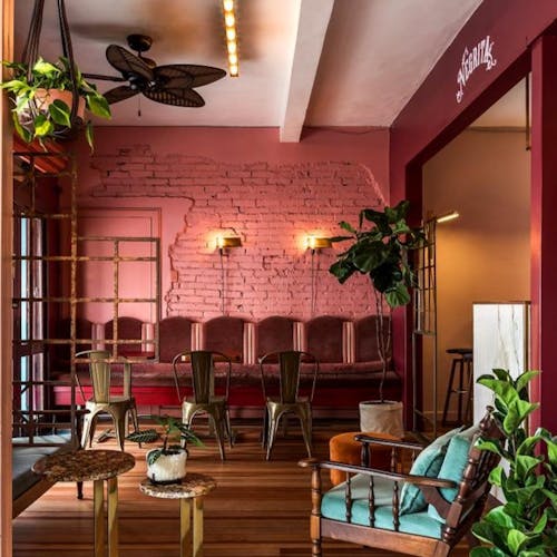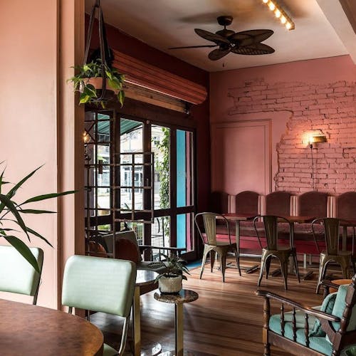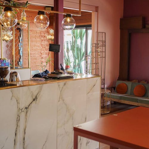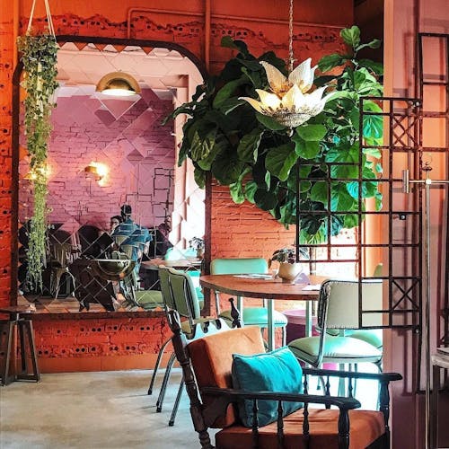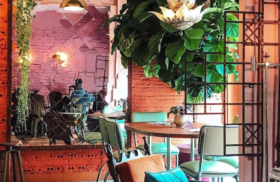 Uma fusão de cafeteria, bar e loja de plantas no mesmo lugar - tudo isso unido a design e uma decoração muito charmosa.