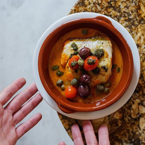 - PESCADO PUTANESCA: Saithe assado com tomate cereja, alcaparrão, azeitona preta e azeite de oliva extra virgem, servido com pesto de ervas frescas