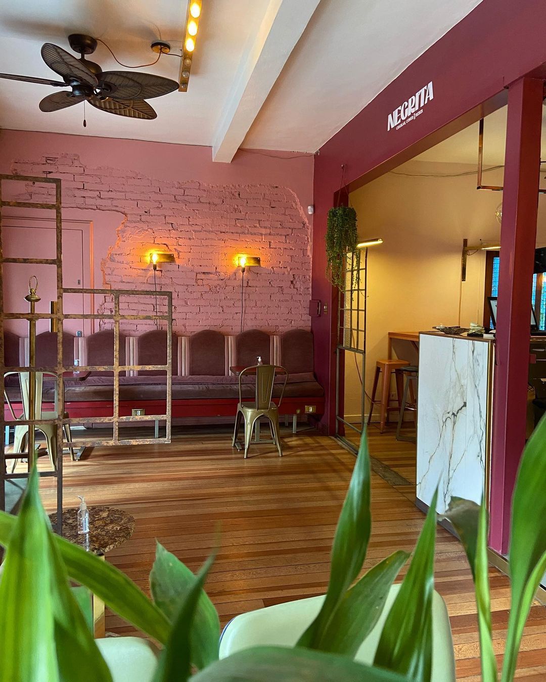 O bar do Negrita, é um destaque à parte quando se entra no oásis. É nele que são feitos os cafés, sucos e coquetéis que animam a casa. O cardápio está em constante mudança, acompanhando as estações e oferece desde um simples café e acompanhamentos até brunch o dia todo.