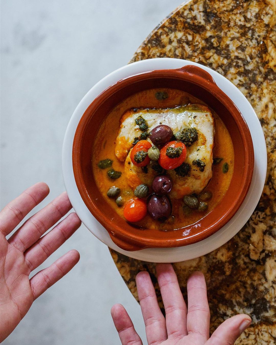 - PESCADO PUTANESCA: Saithe assado com tomate cereja, alcaparrão, azeitona preta e azeite de oliva extra virgem, servido com pesto de ervas frescas
