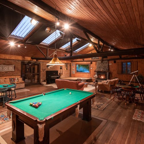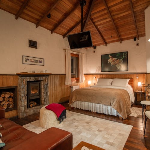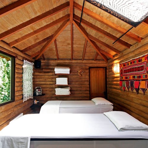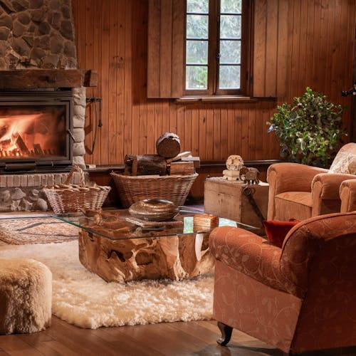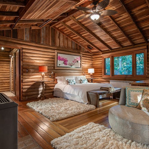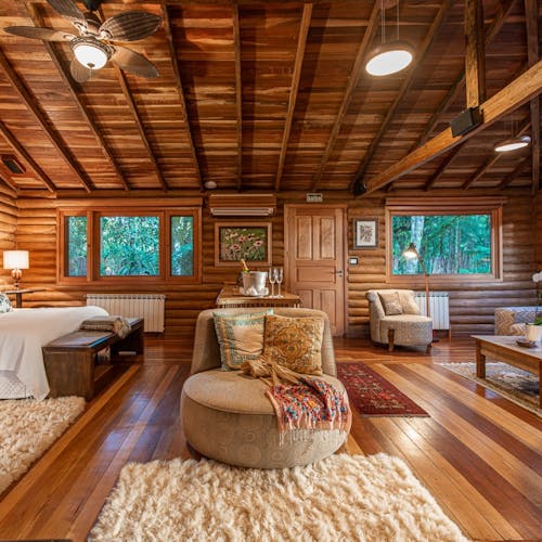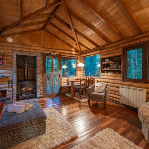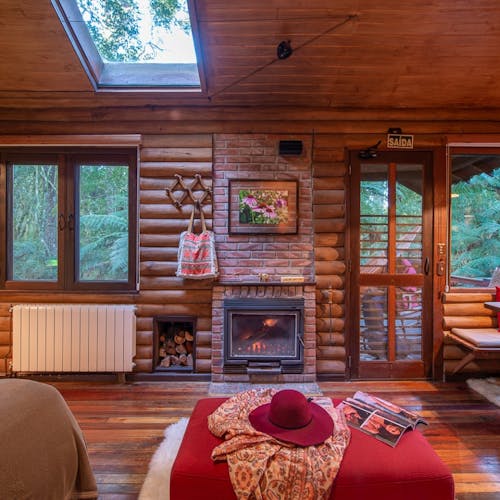 Em geral nas construções das cabanas, predominam o uso de pedras, madeiras, troncos (algumas são construídas no estilo "log house" - quando os troncos ficam um acima do outro), luz natural em aberturas pontuais no teto e tijolinhos.