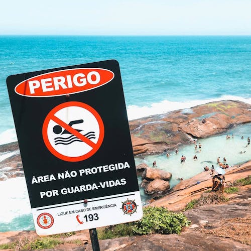 A placa existe por conta de acidentes que podem acontecer caso a maré suba, por isso é importante se organizar com o horário de chegada no local e não se aventurar se as condições não forem favoráveis. Também é bom evitar o local se o mar estiver batendo muito pois a água entra e sai da piscina com bastante rapidez. Nesses casos o melhor é não entrar ou deixar para uma próxima visita! Afinal, se a maré estiver alta não vai ter piscina.
