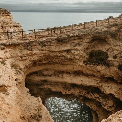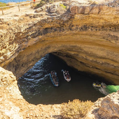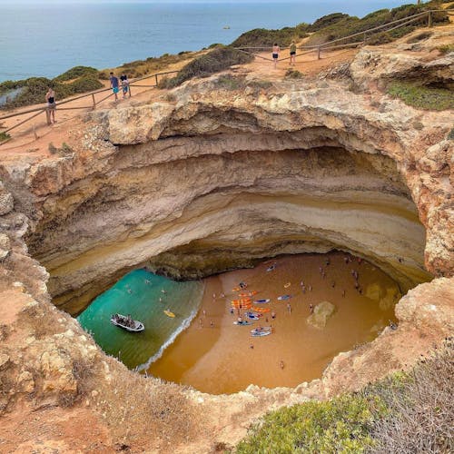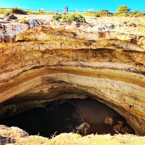 Para ter a vista do alto das falésias, bem ao pé da imensa abertura é preciso caminhar na região de cima da praia. Diversos turistas se juntam ali pra ter a visão de outro ângulo da belíssima praia. A trilha é fácil e sinalizada depois do primeiro trecho. A esquerda da praia de Benagil, fica o restaurante O Pescador e bem ao lado tem uma escadaria. É só seguir o caminho que logo em frente irá se deparar com um portão de propriedade privada. Ao passar por fora desse portão já estará na trilha que vai beirando o mar por cima das falésias. NÃO é permitido ultrapassar o cercado pois as falésias são bem frágeis e sempre há risco de desmoronamento.