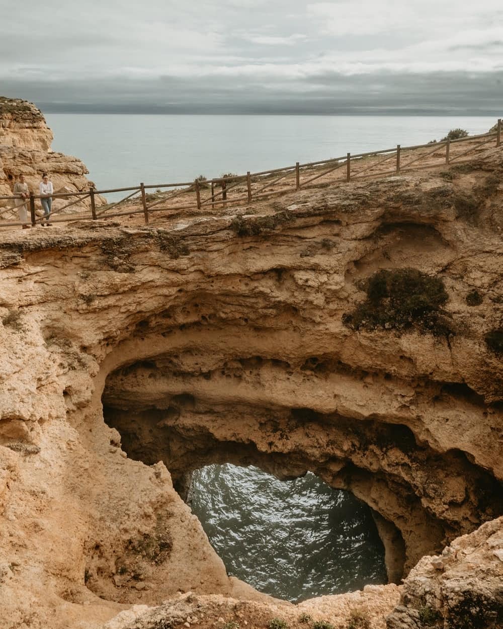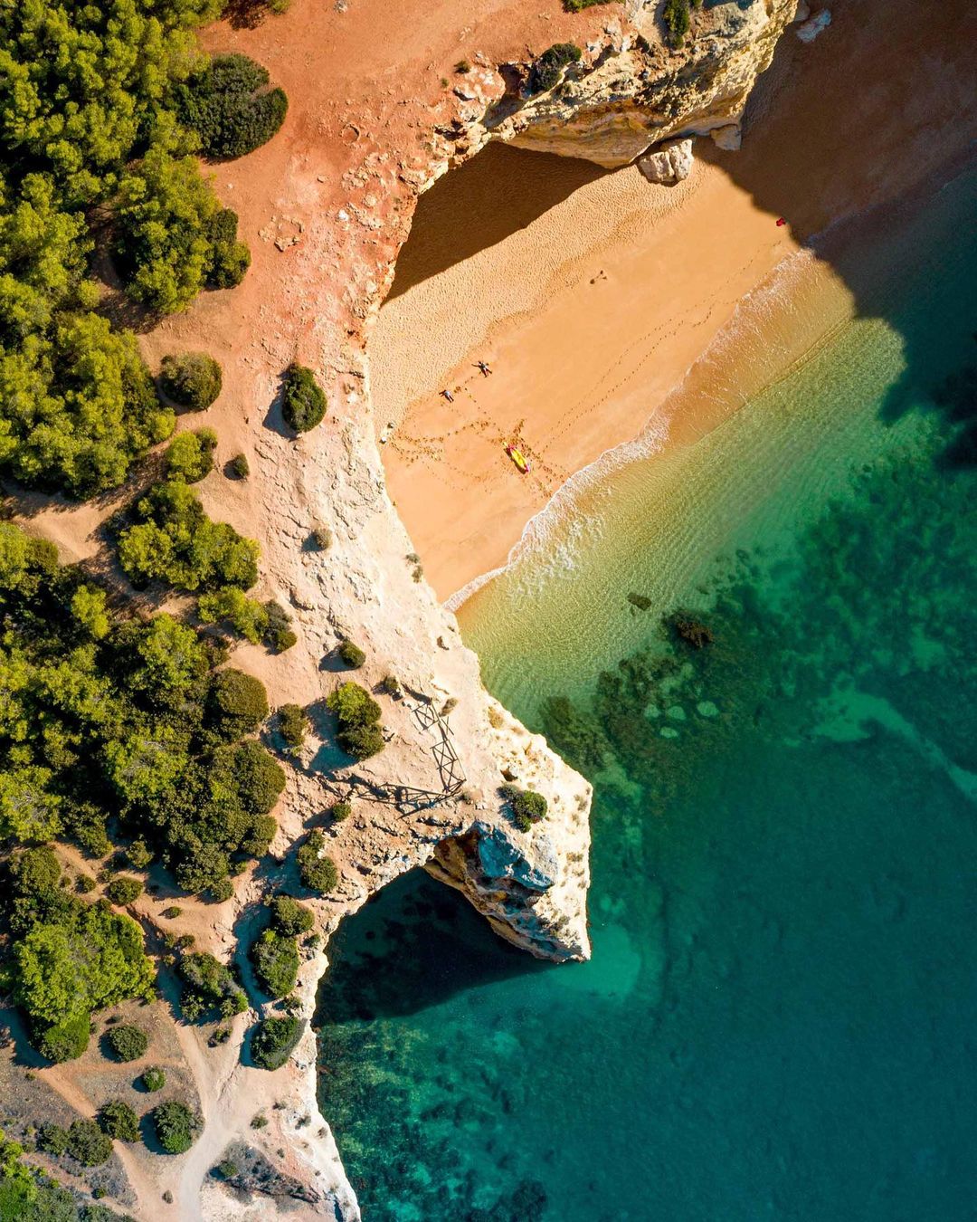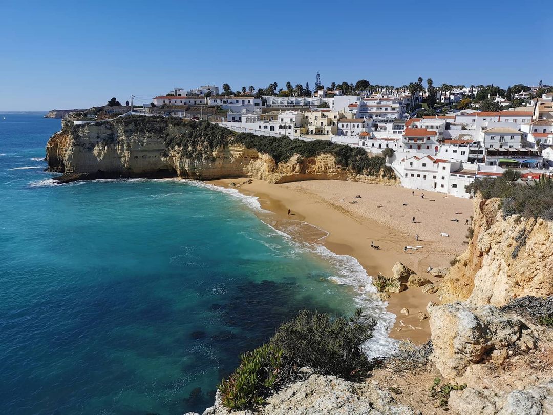 Para ter a vista do alto das falésias, bem ao pé da imensa abertura é preciso caminhar na região de cima da praia. Diversos turistas se juntam ali pra ter a visão de outro ângulo da belíssima praia. A trilha é fácil e sinalizada depois do primeiro trecho. A esquerda da praia de Benagil, fica o restaurante O Pescador e bem ao lado tem uma escadaria. É só seguir o caminho que logo em frente irá se deparar com um portão de propriedade privada. Ao passar por fora desse portão já estará na trilha que vai beirando o mar por cima das falésias. NÃO é permitido ultrapassar o cercado pois as falésias são bem frágeis e sempre há risco de desmoronamento.