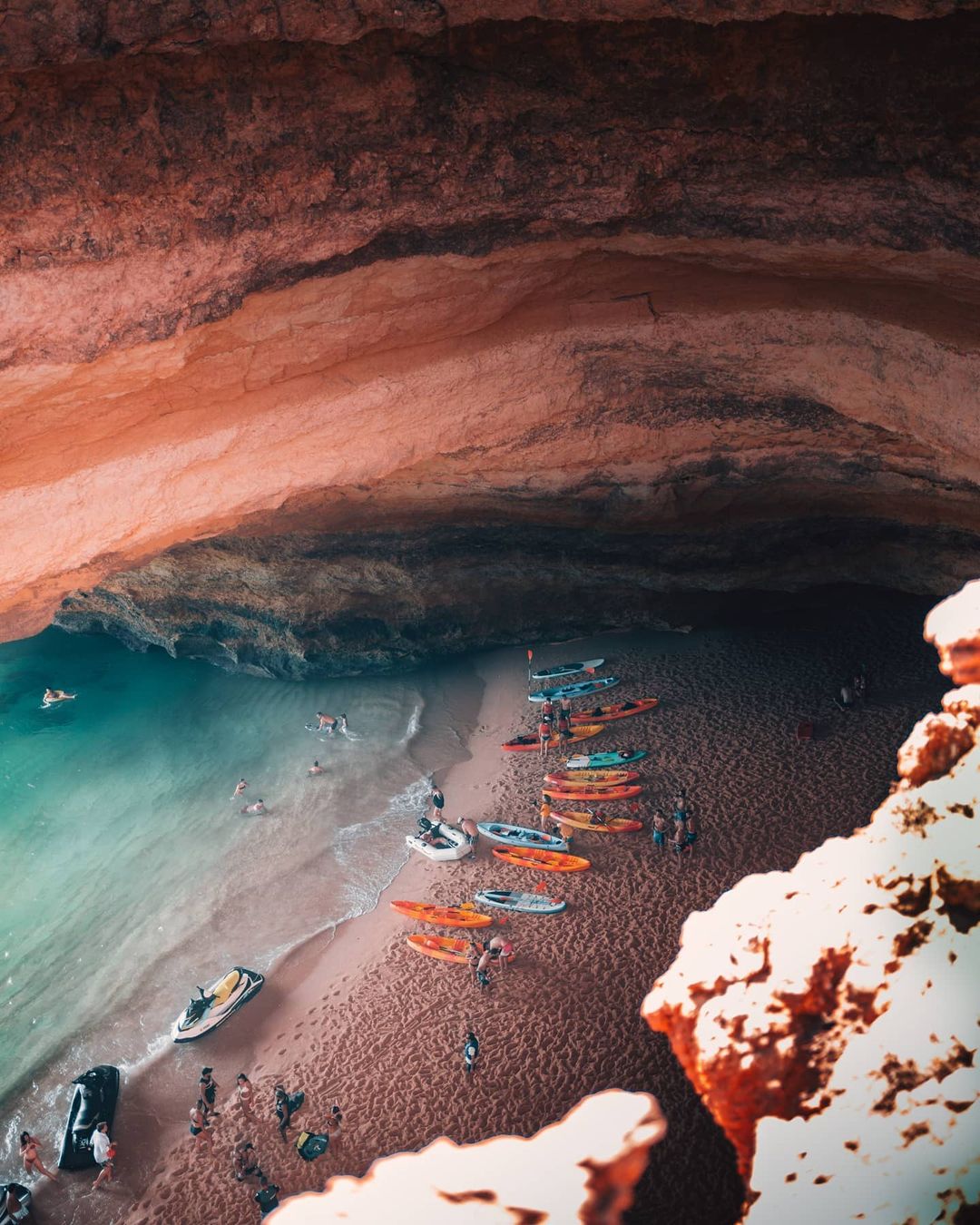 Já para entrar na gruta, é possível contratar o passeio de barco ou alugar o caiaque nas agências de viagem que ficam perto da própria praia e é possível conhecer outros locais além da Gruta de Benagil. Já se você for mais radical e tiver fôlego para ir nadando, fique atento: diversas pessoas são resgatadas durante a tentativa pois o mar ali é muito gelado e com movimentação intensa.