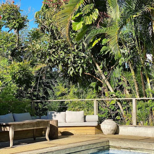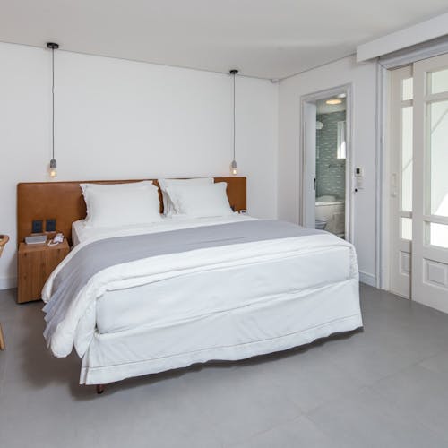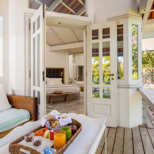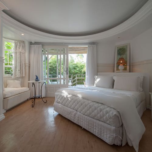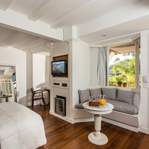 A Sublime Suíte 7 é extremamente aconchegante e tem 27,5m². Possui varanda com cadeiras e vista panorâmica para os jardins, colina e mar.