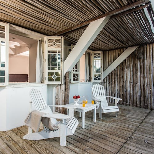 A Sublime Suíte 6 é aconchegante e tem vista parcial para o mar e o teto do banheiro em vidro. Localiza-se próxima da recepção, possui varanda com cadeiras.