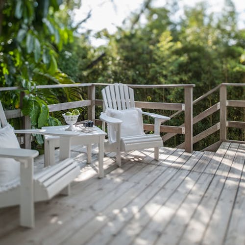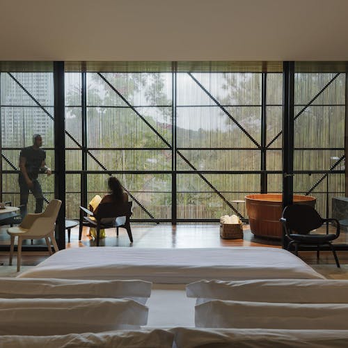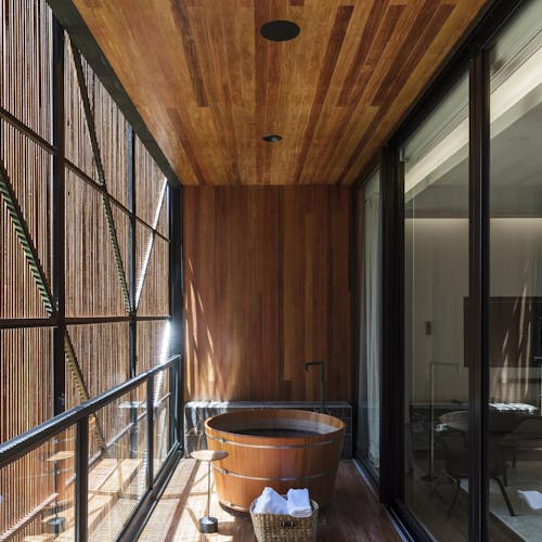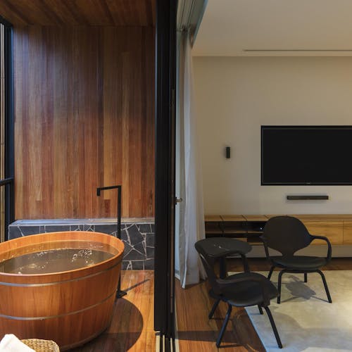Localizada no piso térreo e próxima aos jardins, a Design Suíte 2 possui 33m². O Piso aquecido e uma singular vista panorâmica são alguns diferenciais da acomodação que conta ainda com banheira, varanda deck e cadeiras.