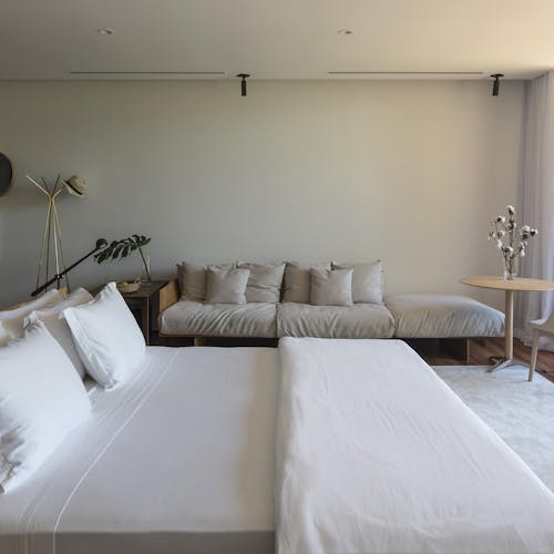 A Design Suíte 12 criada por Vicky Schauffert, mescla modernidade e um estilo minimalista, evocando uma atmosfera acolhedora e elegante, possui isolamento acústico e piso com aquecimento em 30m² com varanda.