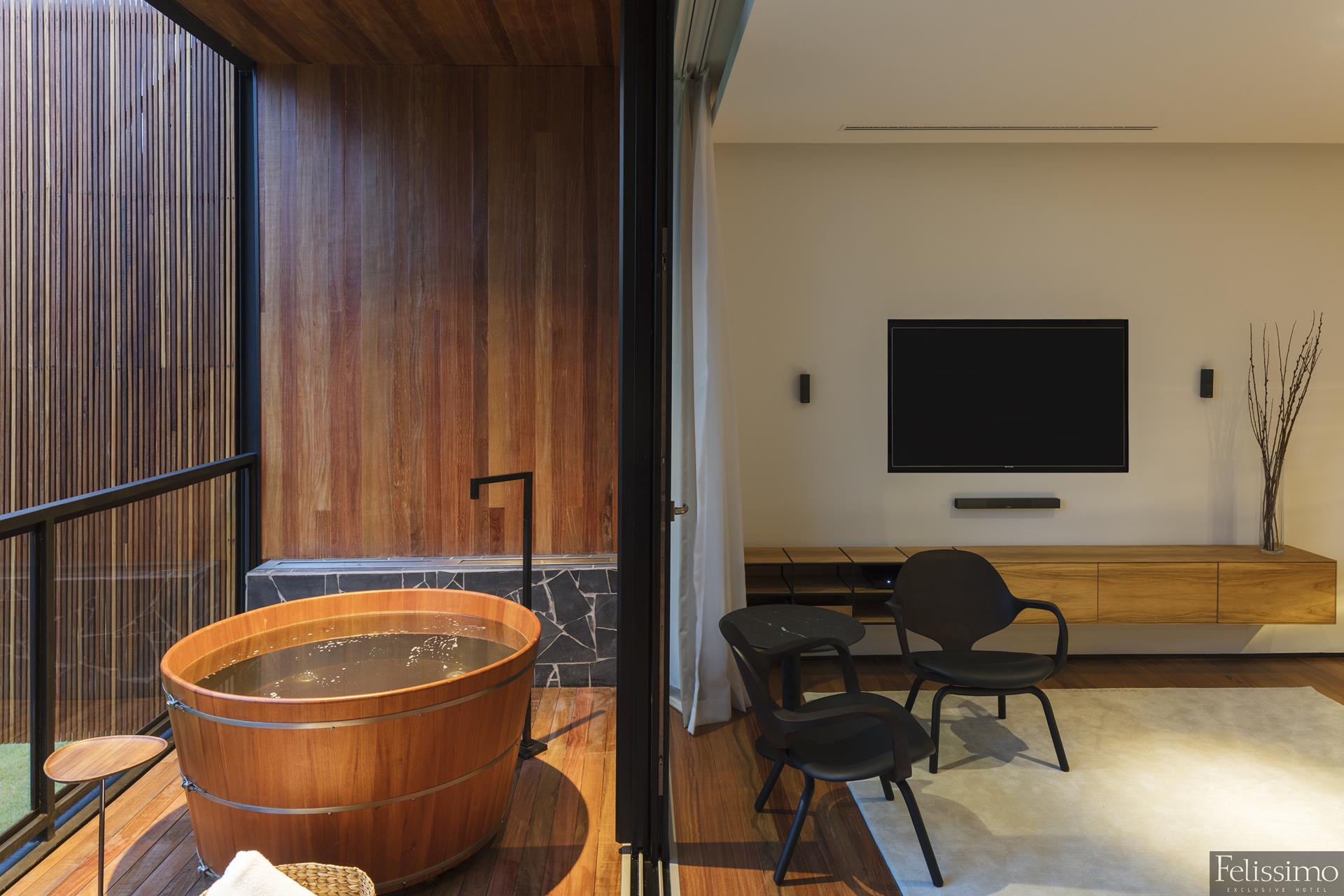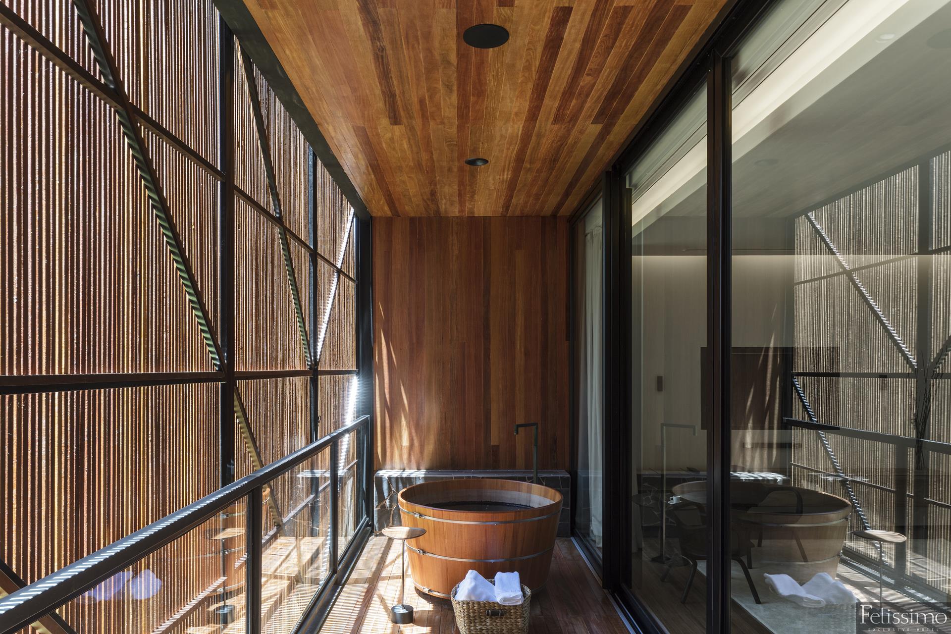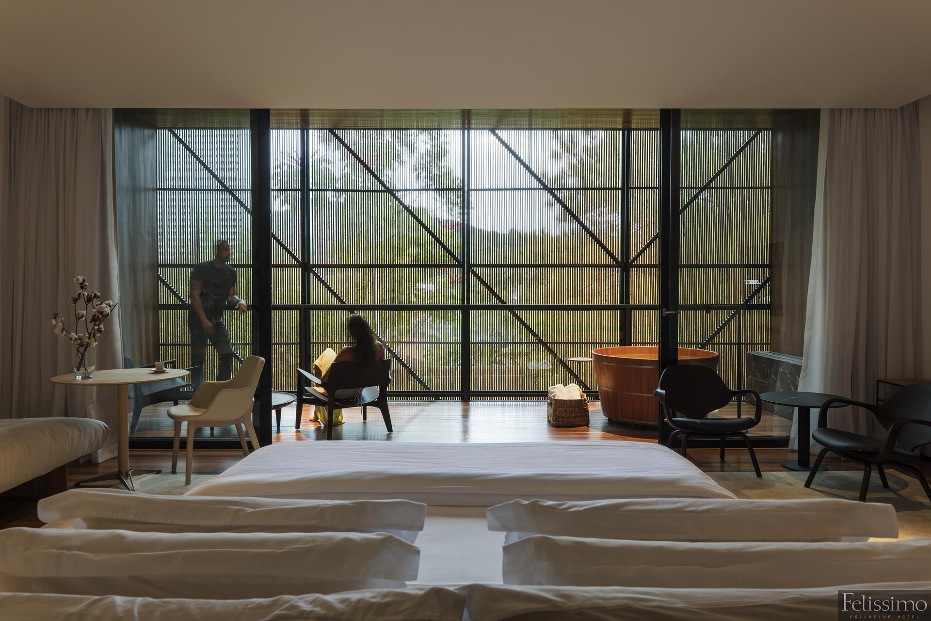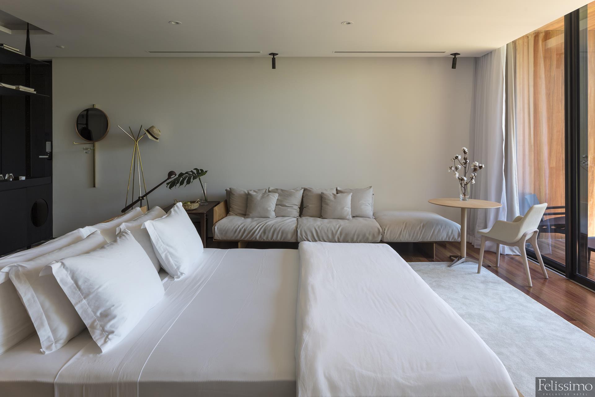 Ambiente acolhedor e convidativo, com todos os serviços Premium do Felissimo Exclusive Hotel: A Vila Graça. Lareira, banheira exclusiva, ampla varanda. 45m²