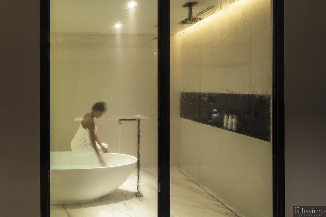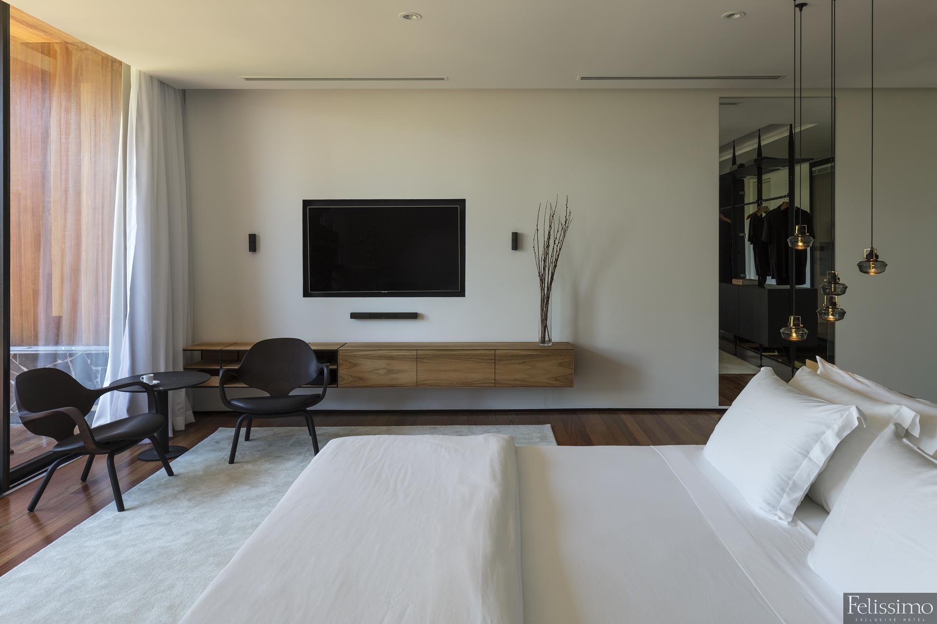 Todas as suítes possuem roupa de cama Trussardi personalizada 400 fios, som Bose bluetooth, Apple tv, iPod com trilha sonora selecionada, linha sustentável de amenities vegan friendly, varanda e banheira.