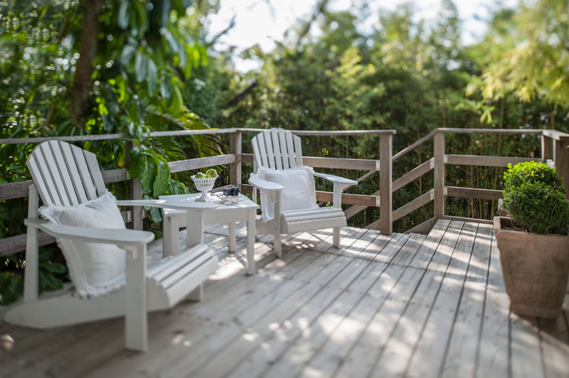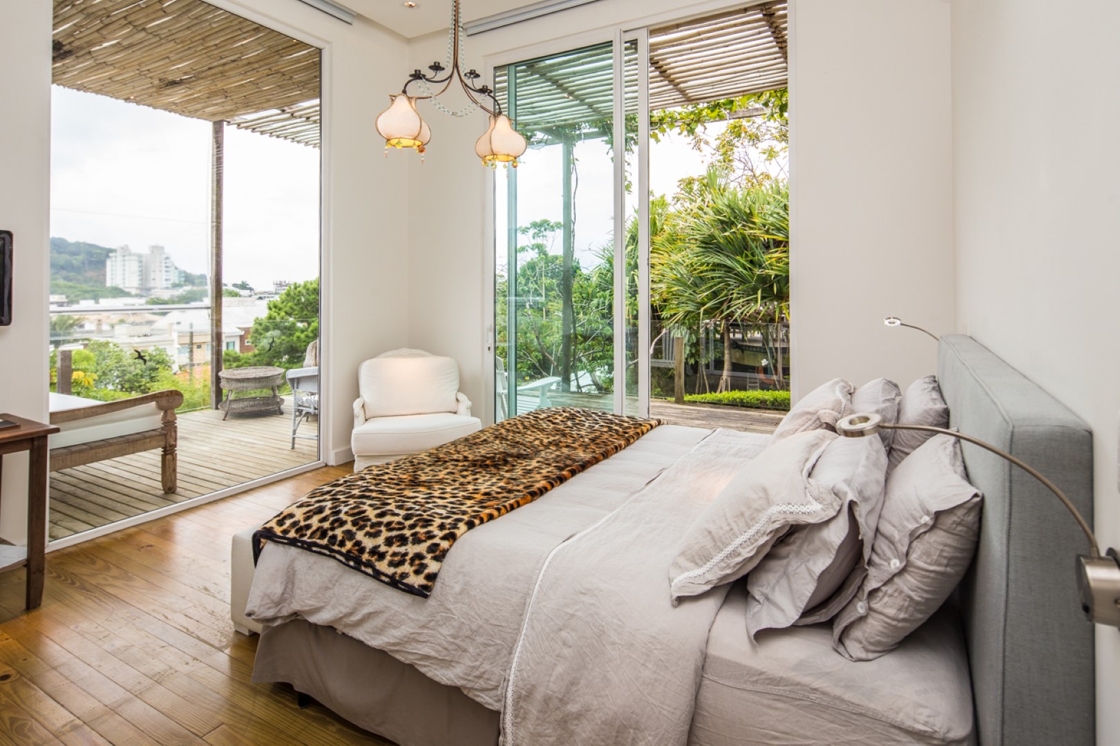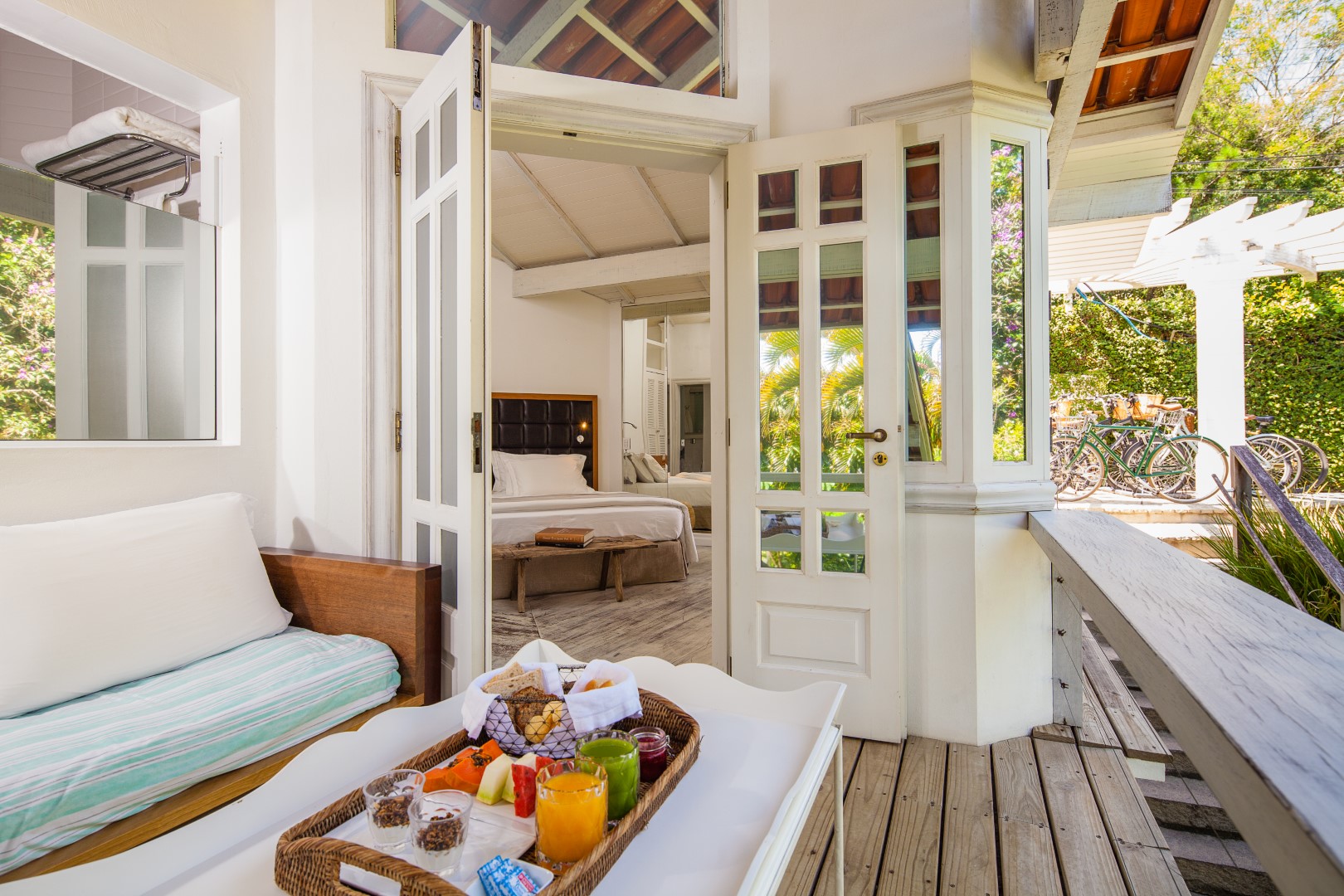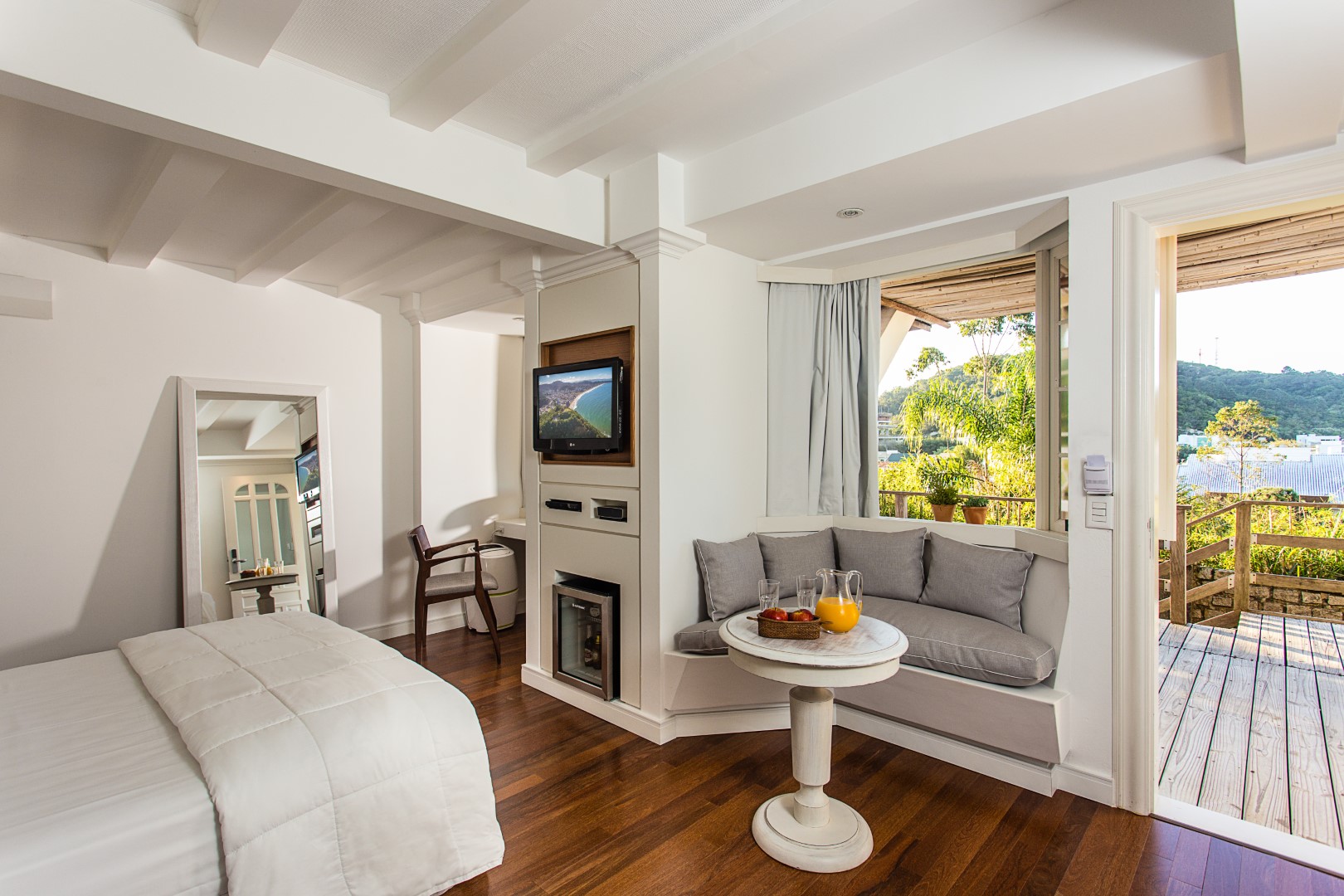 A Sublime Suíte 7 é extremamente aconchegante e tem 27,5m². Possui varanda com cadeiras e vista panorâmica para os jardins, colina e mar.