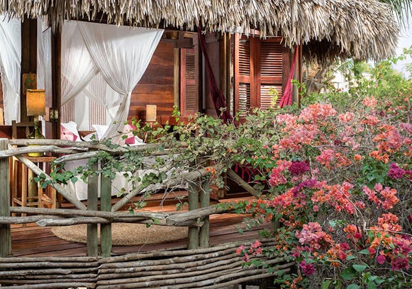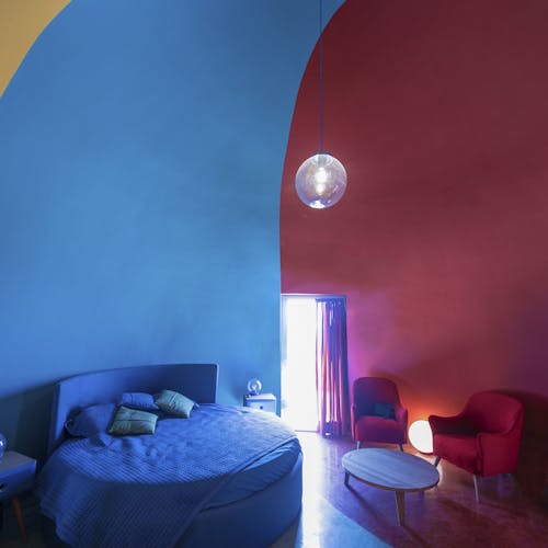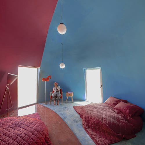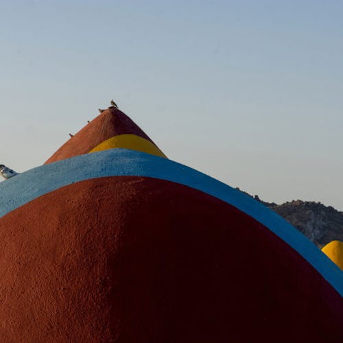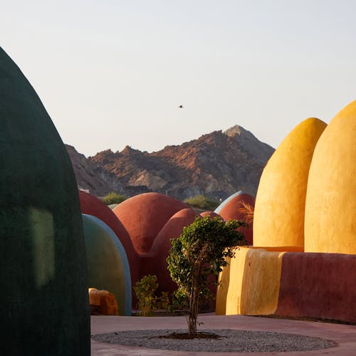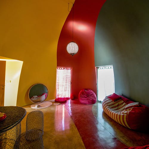 Pintadas de amarelo, vermelho, azul e cinza, as cúpulas explodem em cores inspiradas na singular paisagem da própria ilha, que inclui praias, montanhas e até cavernas coloridas. As cores estão presentes também nas paredes do interior de cada unidade e até nos móveis.