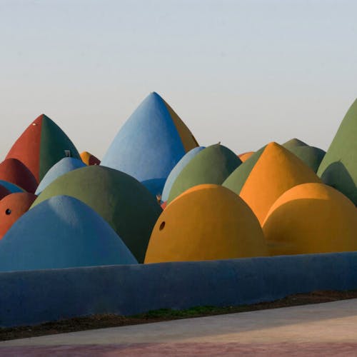 Desenvolvidas pelo arquiteto iraniano Nader Khalili, as cúpulas foram construídas com superadobe, que é uma técnica construtiva onde sacos são preenchidos com terra e comprimidos para serem posicionados uns sobre os outros, formando paredes. Neste projeto em questão, os sacos foram apoiados em aço e finalizados com cimento.