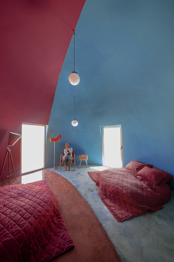 Pintadas de amarelo, vermelho, azul e cinza, as cúpulas explodem em cores inspiradas na singular paisagem da própria ilha, que inclui praias, montanhas e até cavernas coloridas. As cores estão presentes também nas paredes do interior de cada unidade e até nos móveis.
