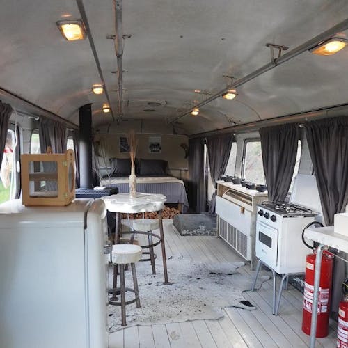 Alaska fica posicionado em uma área repleta de natureza e em sua volta há uma cabana comunitária além de uma banheira ao ar livre. No espaço social compartilhado com as demais cabanas que o local oferece como hospedagem, é possível encontrar tv, uma piscina rasa de pedras, internet, lareira, cozinha, churrasqueira, pebolim, banheiros (também presente em casinhas logo ao lado de fora do ônibus) e o mais importante - a incrível vista do lugar!