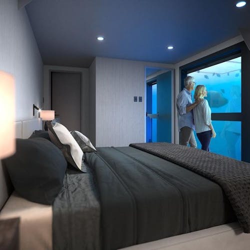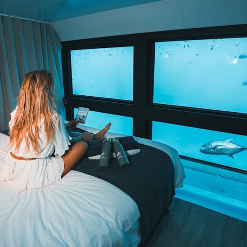 🛌. São apenas dois quartos subaquáticos disponíveis (com cama king-size ou duas camas individuais). Cada quarto dispõe de roupa de cama premium, banheiro com paredes de vidro e vista panorâmica do espetacular mundo subaquático da Grande Barreira de Corais. Todas as refeições inclusas, café da manhã, chás da manhã e da tarde, almoço e jantar. Todas as bebidas, incluindo cerveja e vinho (coquetéis e destilados a um custo adicional). Também incluso o jantar sob as estrelas. Atividades no recife, incluindo um passeio guiado de mergulho com snorkel e passeio semissubmarino também fazem parte do pacote, assim como acesso ao observatório subaquático. Mergulho autônomo: à parte.