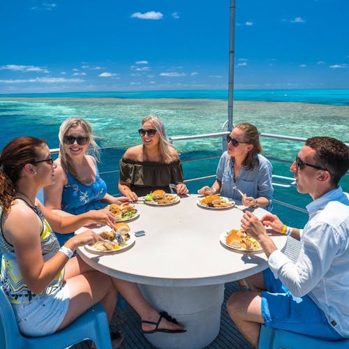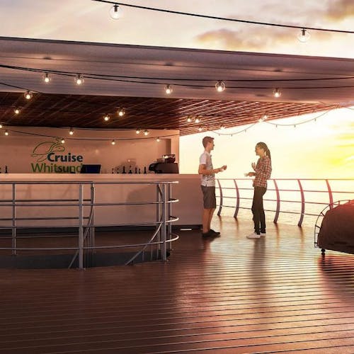 Como funciona: A jornada começa com o cruzeiro indo até o recife externo através das lindas Ilhas Whitsunday - baleias Jubarte migratórias entre julho e setembro aparecem e é um bônus extra de experiência com vida marinha! No recife além das atividades citadas, ainda é possível nadar em um semissubmarino e visitar um observatório subaquático - seguido por um almoço de farto buffet. Depois que os excursionistas voltam à costa, o pontão (estilo da embarcação) e o recife são exclusivamente de quem está hospedado nessa suíte. Desfrute de uma bebida ao pôr do sol antes do jantar que é servido no convés, com produtos locais e frescos. Depois, vá para o nível superior do pontão e deslize para o seu aconchegante Reefbed - uma espécie de rede fixa sobre a água - é só você, o oceano e uma galáxia de estrelas. O amanhecer no recife é pacífico e sem pressa. Haverá tempo para mais mergulho com snorkel após o café da manhã - o recife é todo só para você - ou pode voltar para o observatório subaquático e observar o recife ganhar vida. Após o almoço, o navio Cruise Whitsundays o leva de volta ao continente. O caminho de volta do cruzeiro é panorâmico pelas ilhas até o recife externo, onde acontece um novo mergulho com snorkel e todo o equipamento é fornecido, incluindo roupas de mergulho e macacões no caso de mergulho com cilindro.