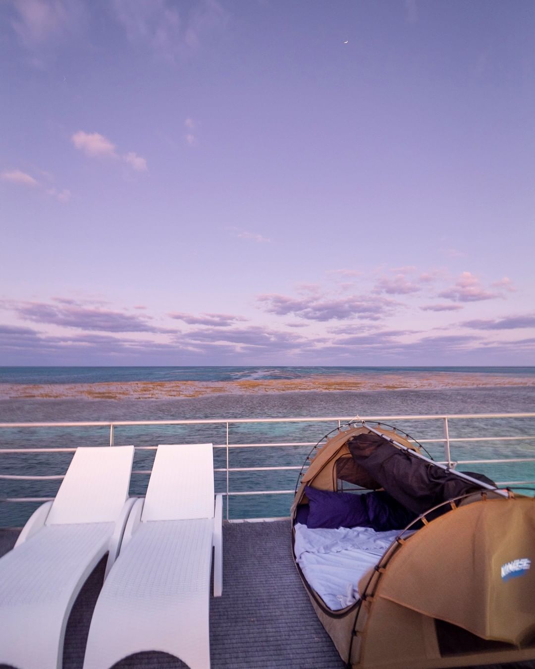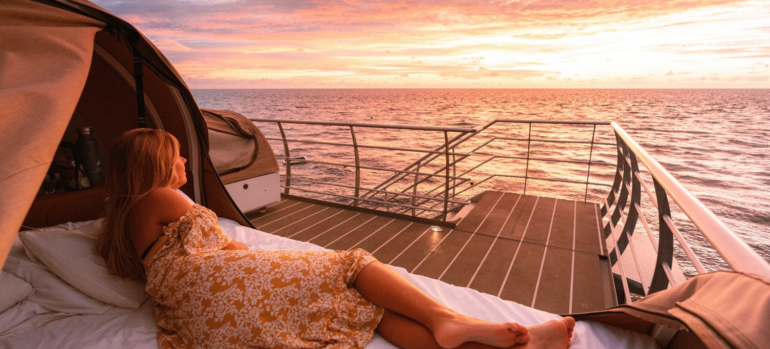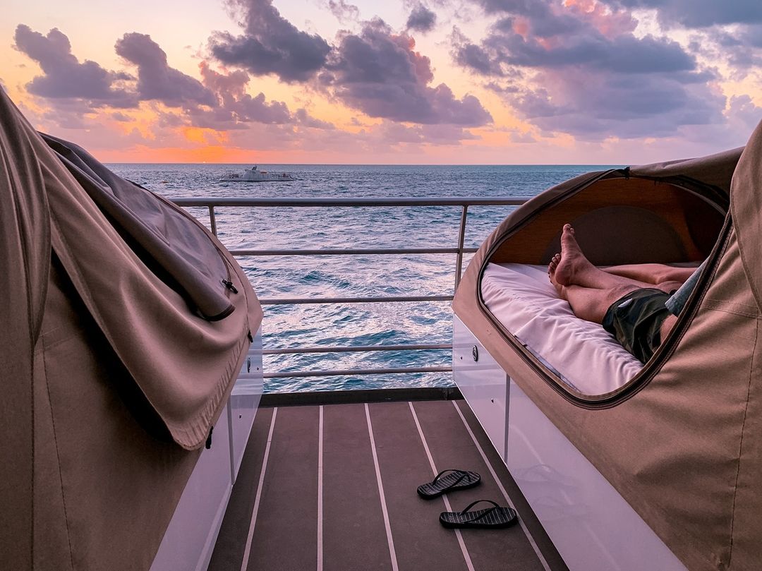 O dia dentro da água, à noite sob as estrelas. É assim a experiência na "tenda" que fica sobre a embarcação.