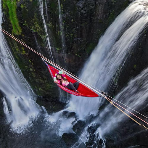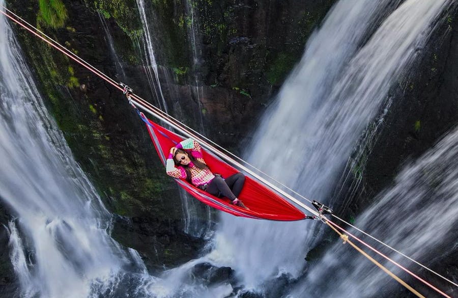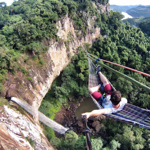 Você relaxaria em uma rede suspensa a 50 metros de altura sobre uma cachoeira? Uma aventura brasileira inédita!