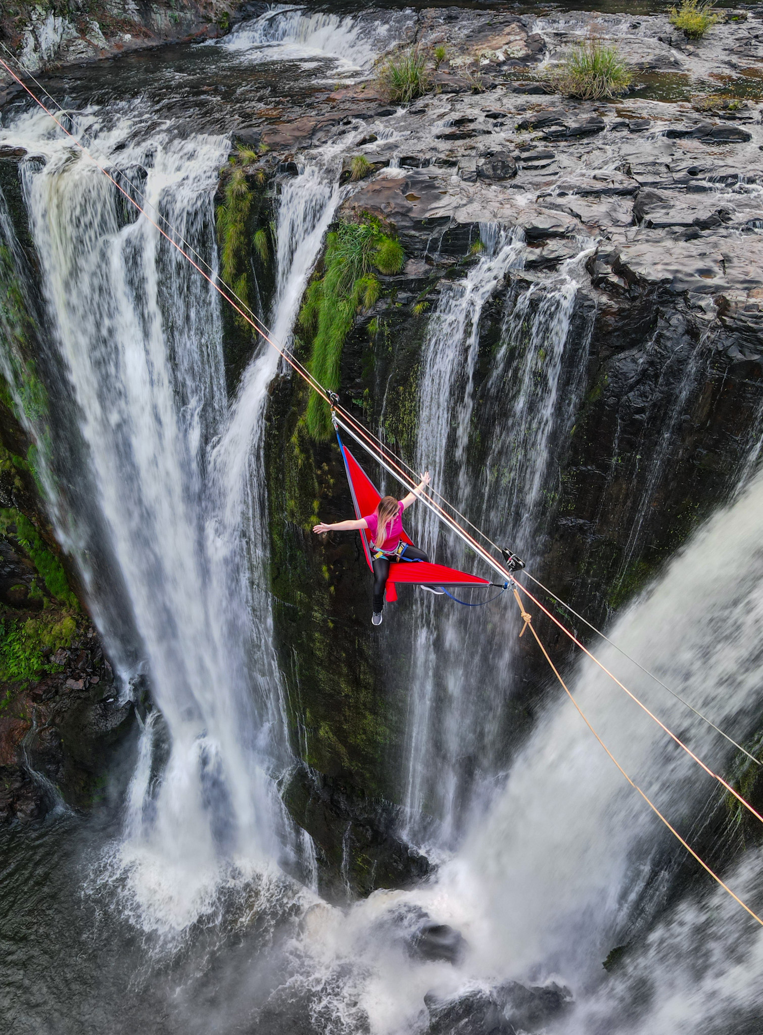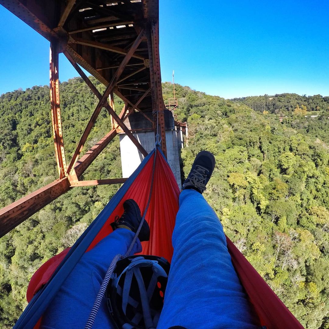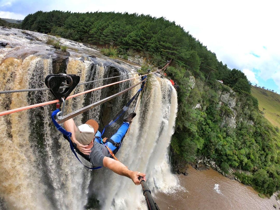 Rede Suspensa, uma experiência inédita que acontece no Cachoeirão do Rio Cerquinha, em Bom Jesus, município do Rio Grande do Sul. A cachoeira paradisíaca tem mais de 50 metros de altura e 90 metros de extensão. A experiência também pode acontecer em outros locais sob consulta prévia.