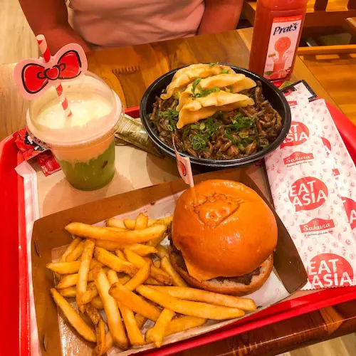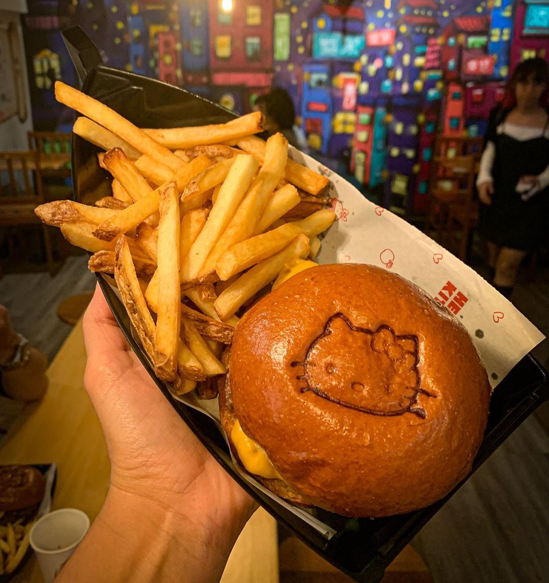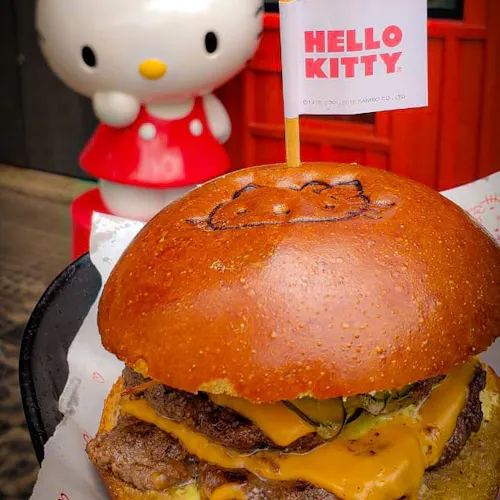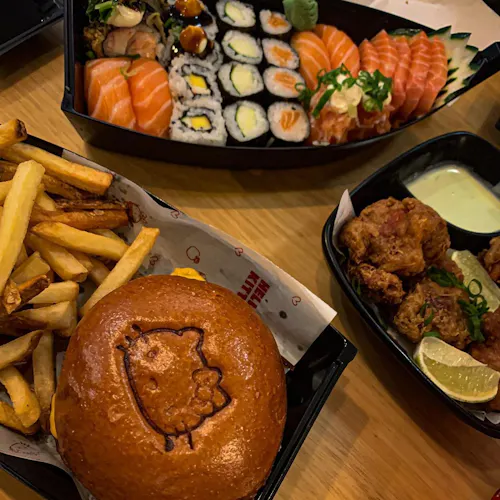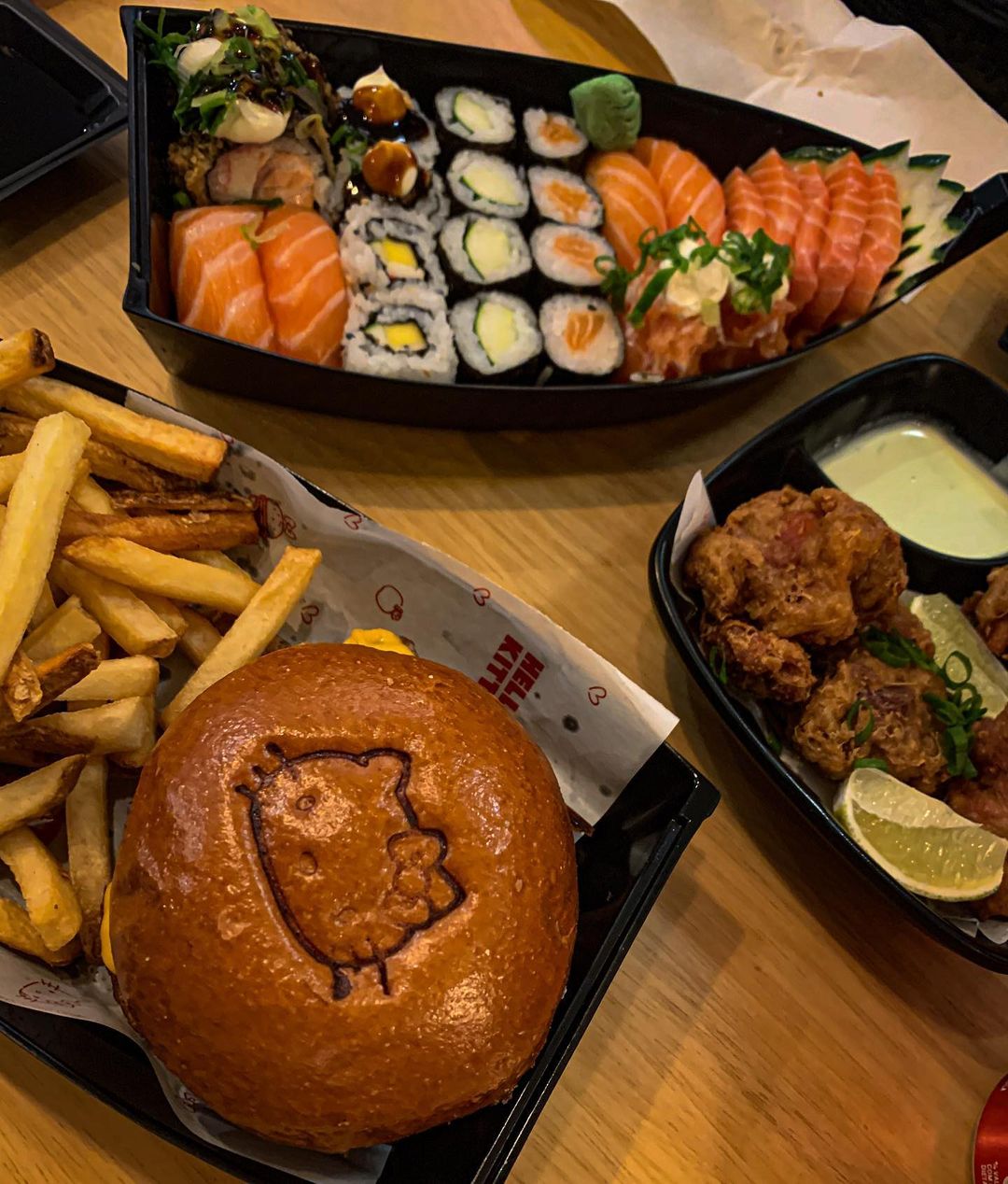 Já no cardápio salgado, é variado: de hambúrgueres (feitos de carne wagyu ou vegetariano) todos com a cara da Hello Kitty estampada no pão, yakissobas e até combinados de sushis e rolls, pink lemonade para beber, entre outros.