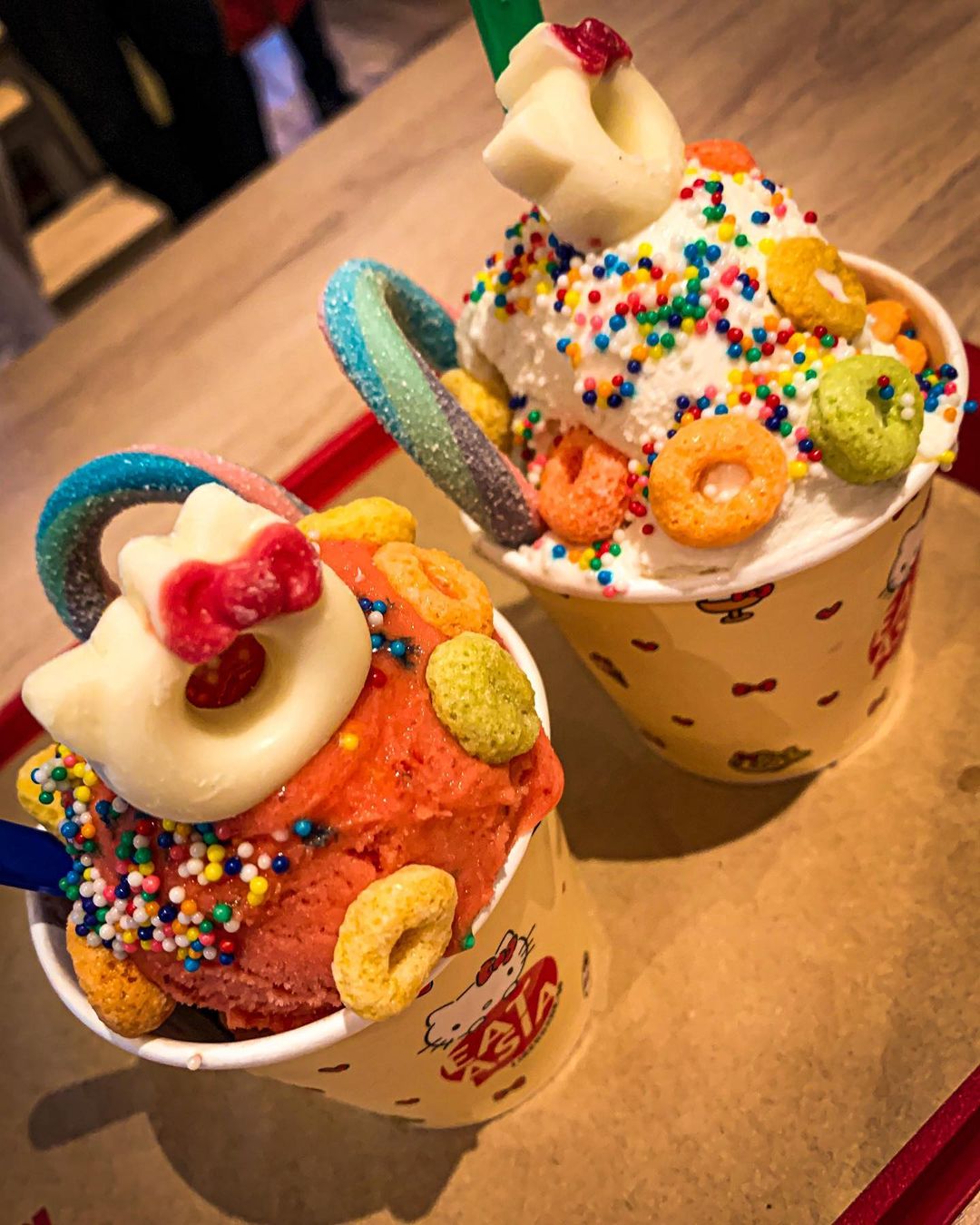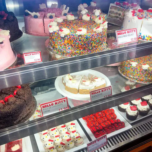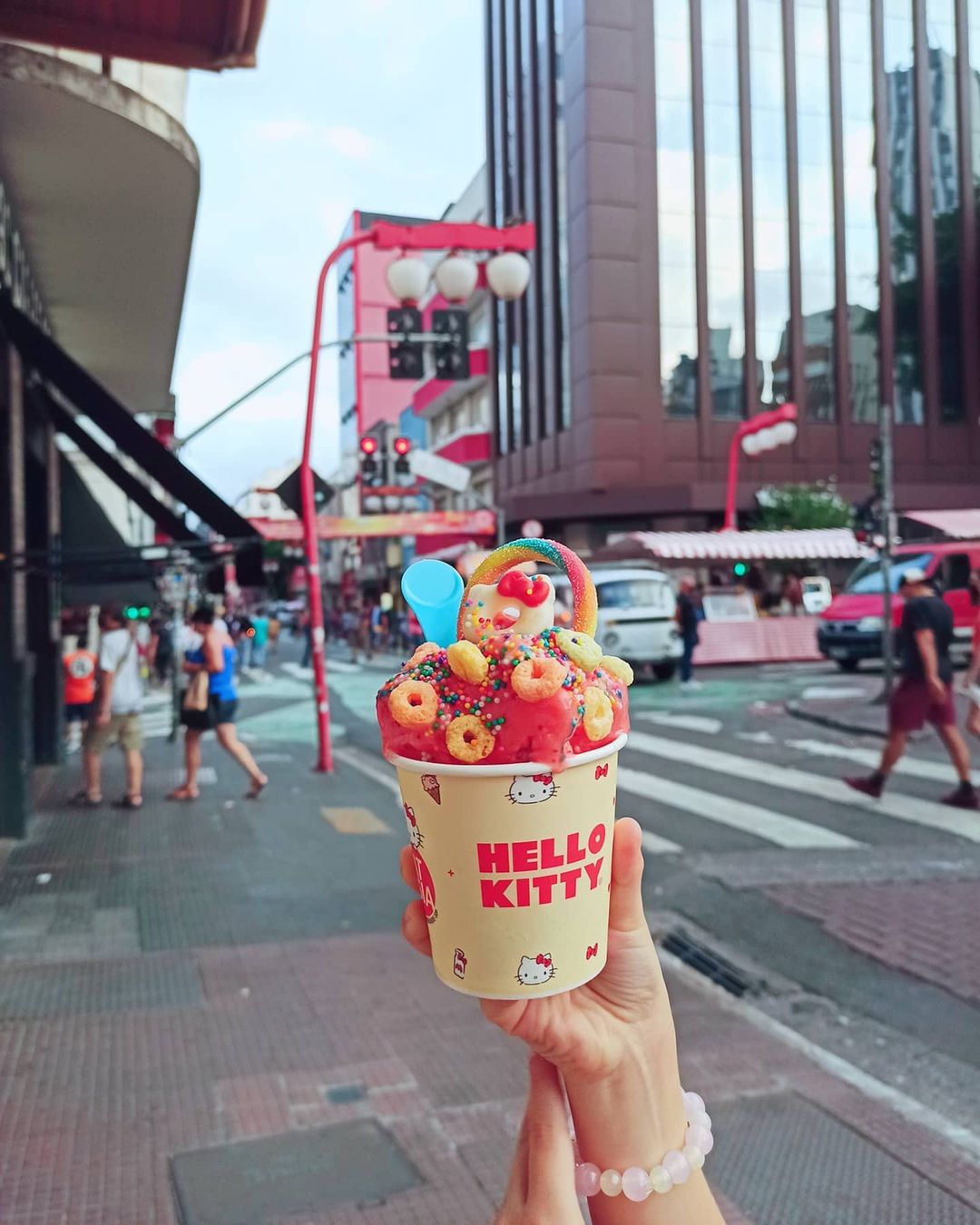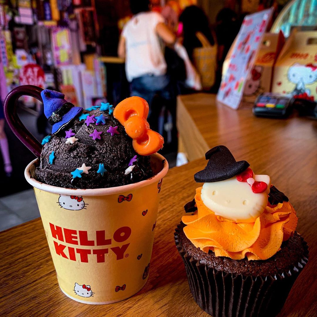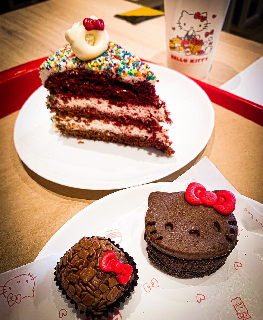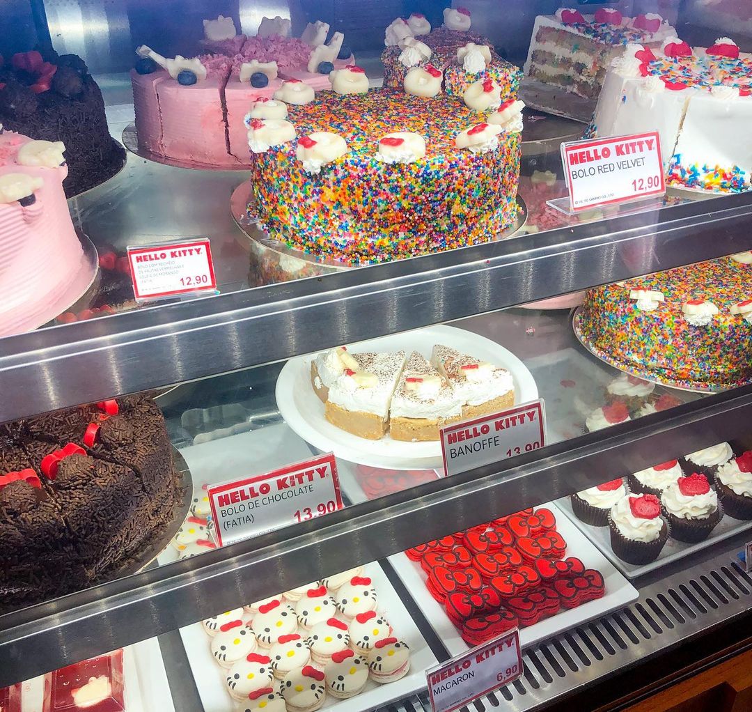 Os fãs de doce se preparem: alguns dos destaques do novo espaço são os Gelatos by Hello Kitty bem elaborados e cheios de toppings, macarons, brownies de chocolate, os bolos multicoloridos e o um Banoffe.