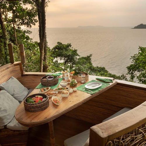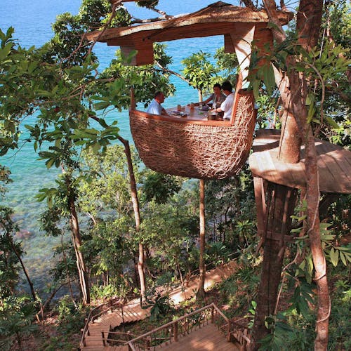 O primeiro passe é entrar na cesta de bambu e se preparar para começar a ser içado até a altura correta. O visual panorâmico proporciona uma belíssima vista da praia e da floresta tropical de Koh Kood, onde o hotel fica localizado.